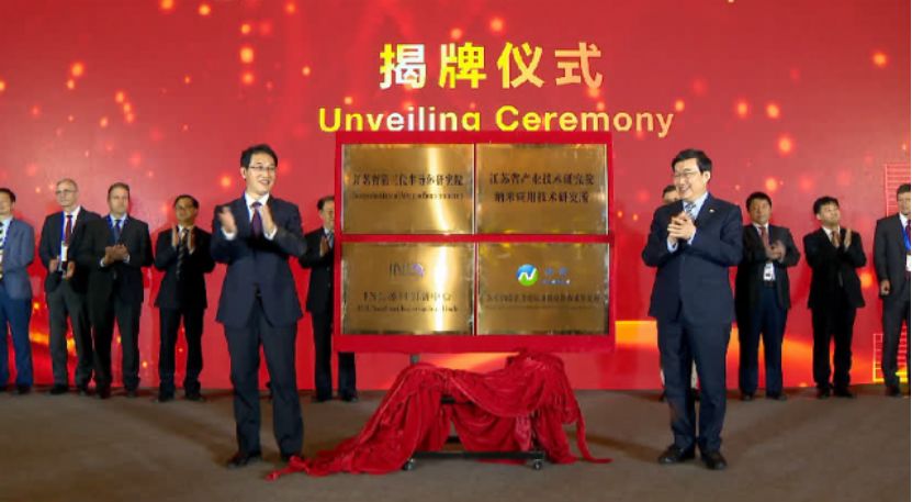 随后,进行的是揭牌仪式。14个纳米产业重点项目集中签约和开工开业,江苏省第三代半导体研究院、伊比利亚(苏州)创新中心等揭牌。许宁生院士和吴庆文书记共同参与揭牌。