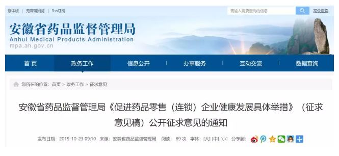 10月23日,安徽省药监局印发了《促进药品零售(连锁)企业健康发展具体举措(征求意见稿)》(以下简称《举措》),并公开征求意见和建议。