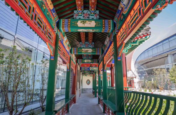 在航站楼五个指廊的尽端,分别设有5个中式风格的室外庭院——中国园、瓷园、田园、丝园、茶园,使室内外空间相互融合,为旅客提供了放松的候机环境和绿色的活动空间。其中,中国园是五个园区中唯一拥有建筑物的园区,八角亭、六角亭、敞轩、榭、廊、殿座、歇山顶、硬山顶、悬山顶……这里几乎涵盖了中国传统古建筑所具有的全部特点。
