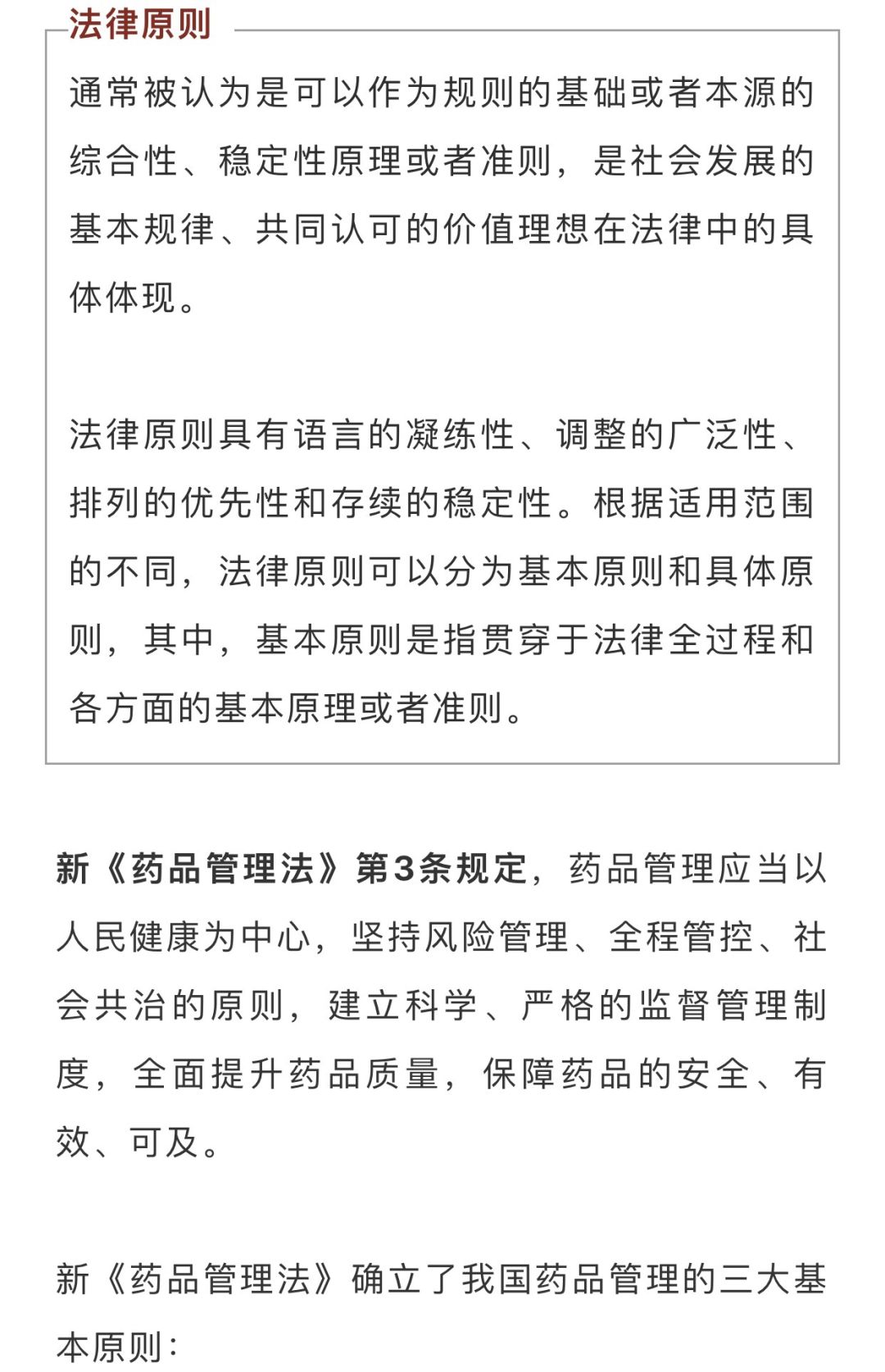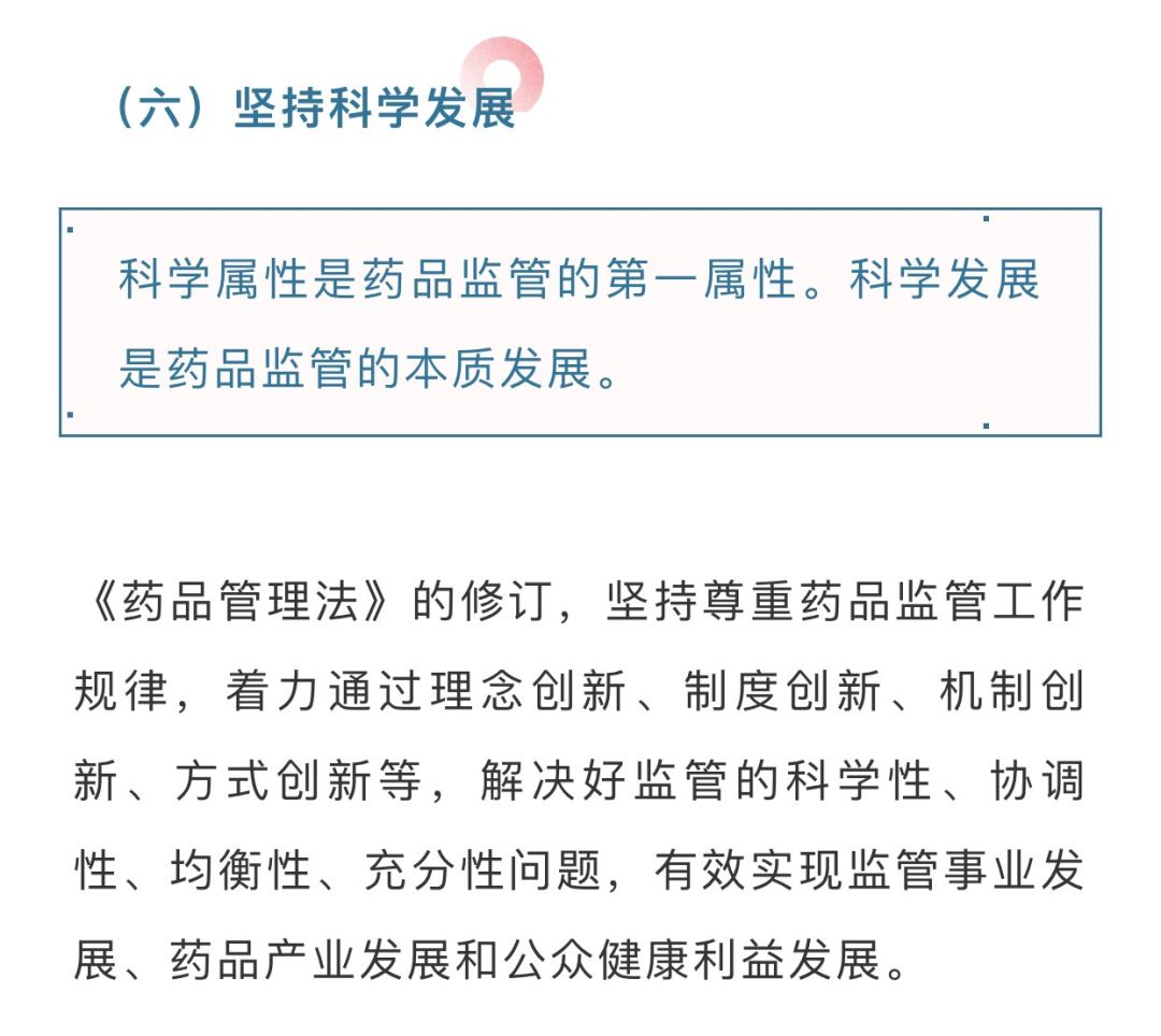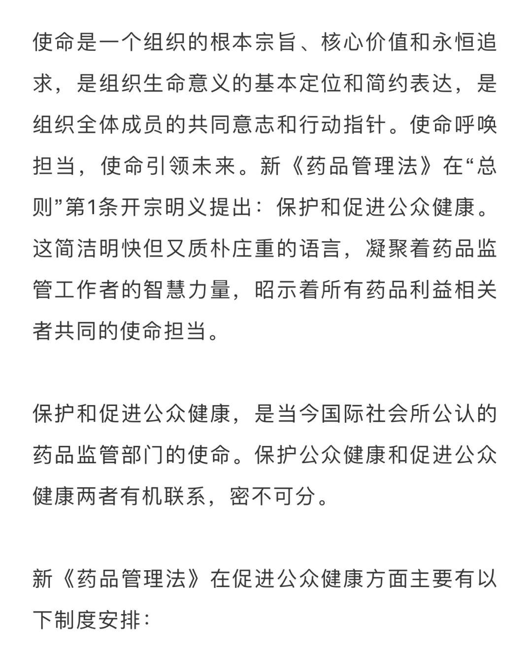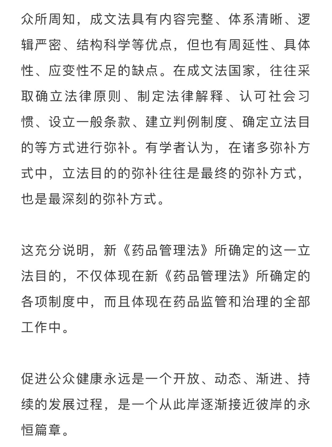 新《药品管理法》的篇章结构设计体现了新时代药品监管工作规律,有利于鼓励药物研制创新,有利于强化各方主体责任,有利于全生命周期监管,有利于落实药品供应保障,有利于保障公众用药安全、有效和可及。