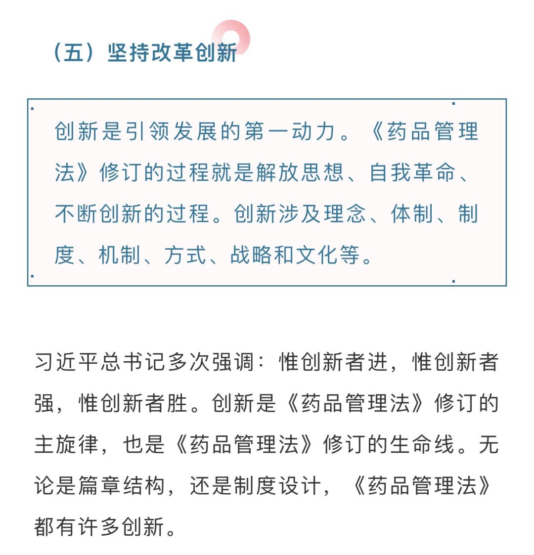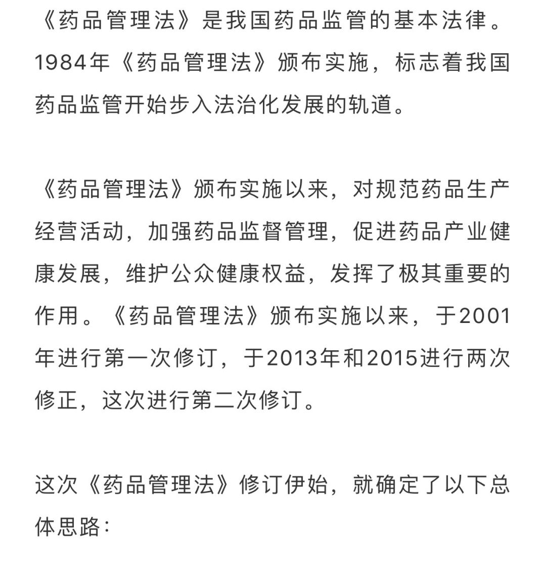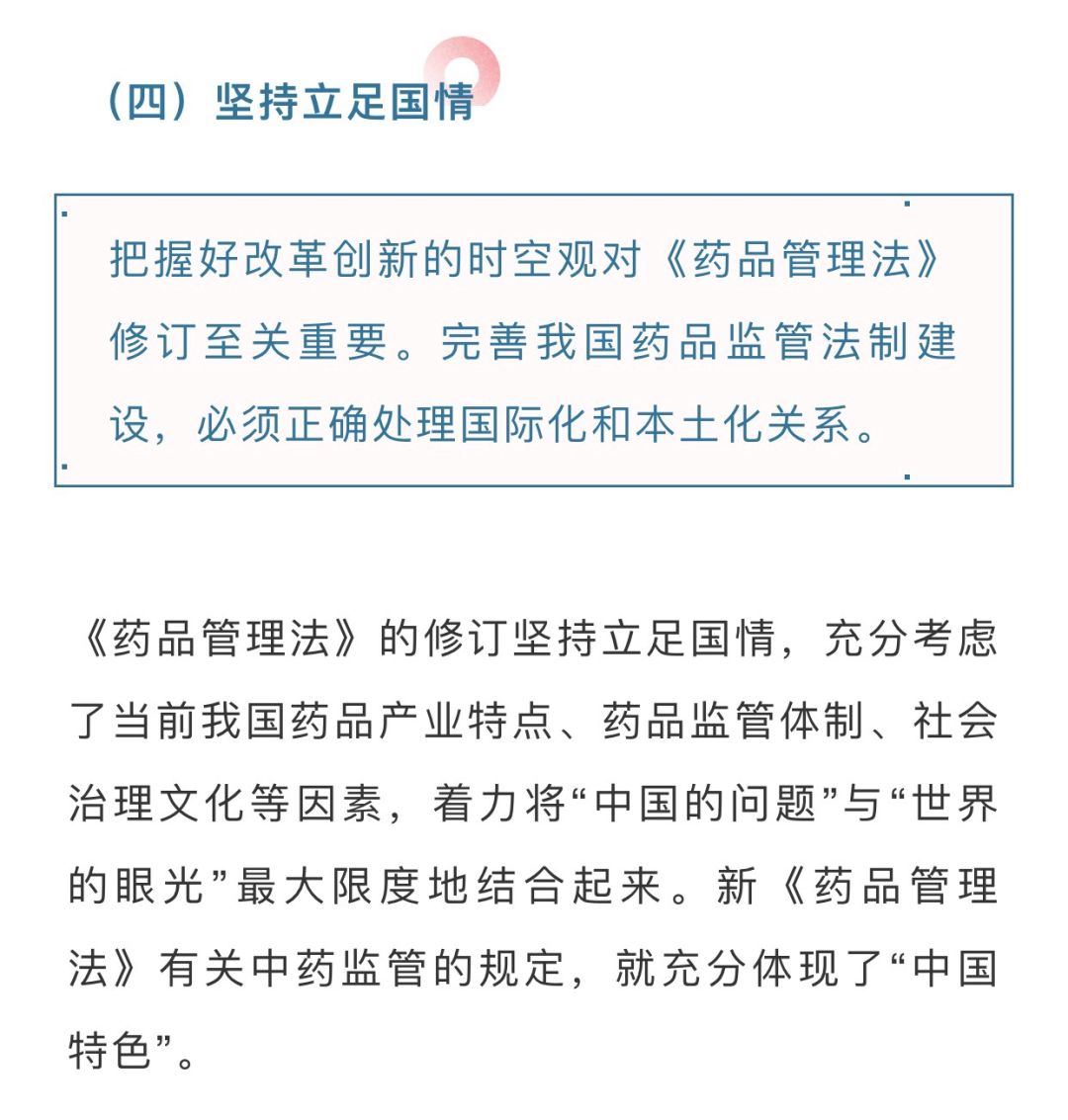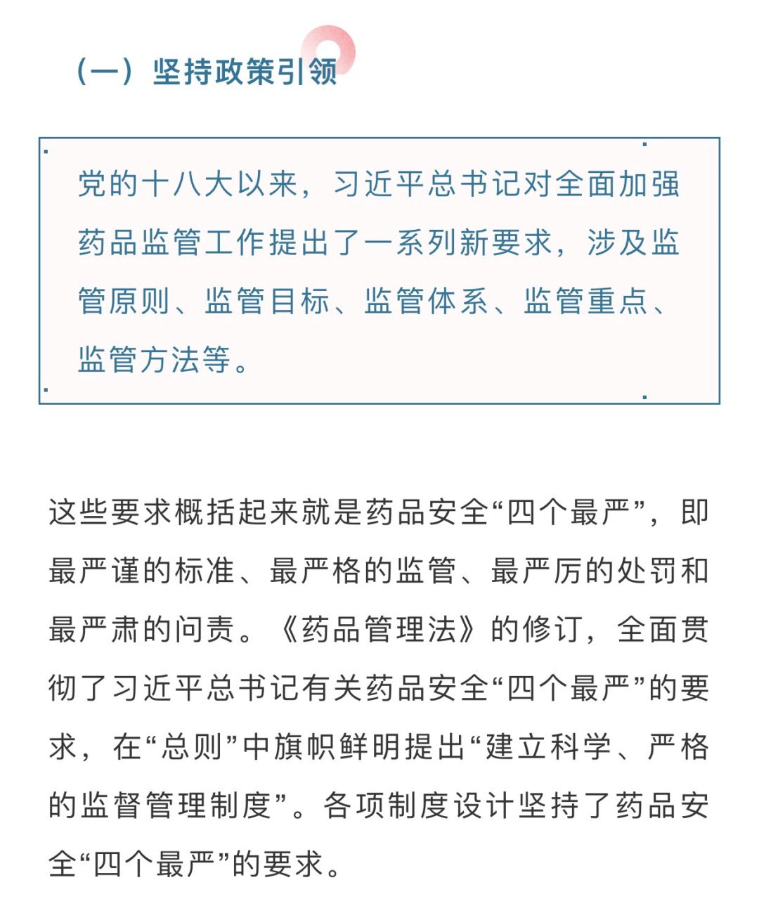 新《药品管理法》的篇章结构设计体现了新时代药品监管工作规律,有利于鼓励药物研制创新,有利于强化各方主体责任,有利于全生命周期监管,有利于落实药品供应保障,有利于保障公众用药安全、有效和可及。