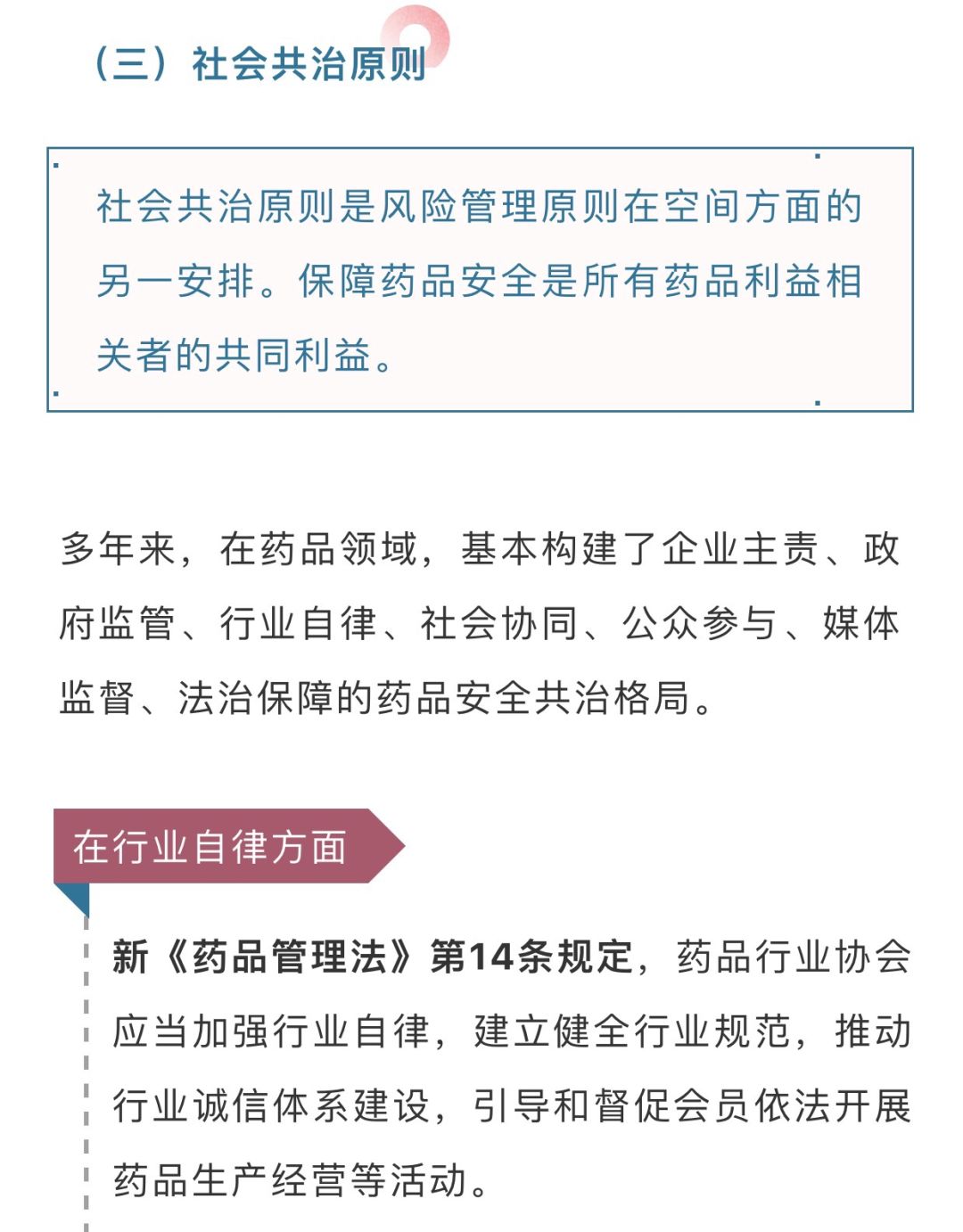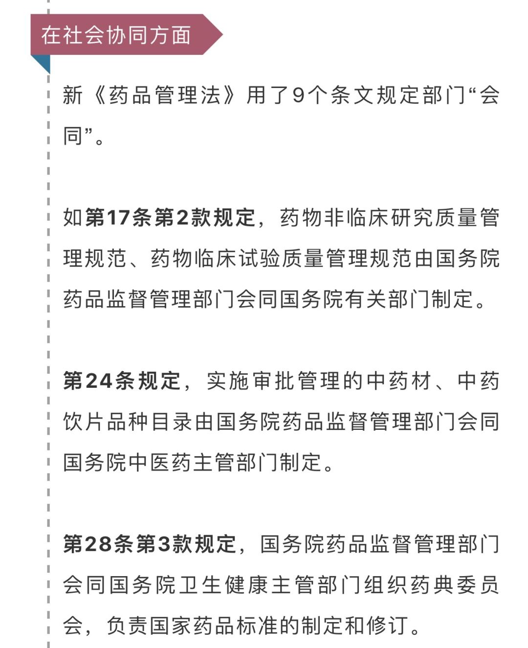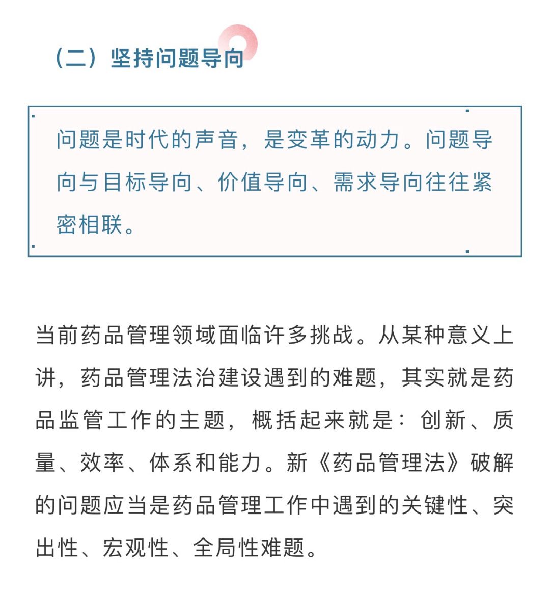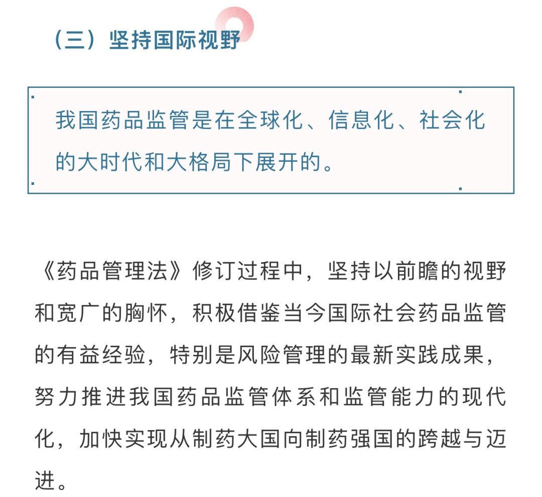 新《药品管理法》的篇章结构设计体现了新时代药品监管工作规律,有利于鼓励药物研制创新,有利于强化各方主体责任,有利于全生命周期监管,有利于落实药品供应保障,有利于保障公众用药安全、有效和可及。