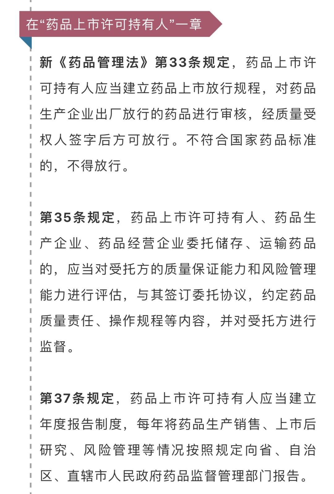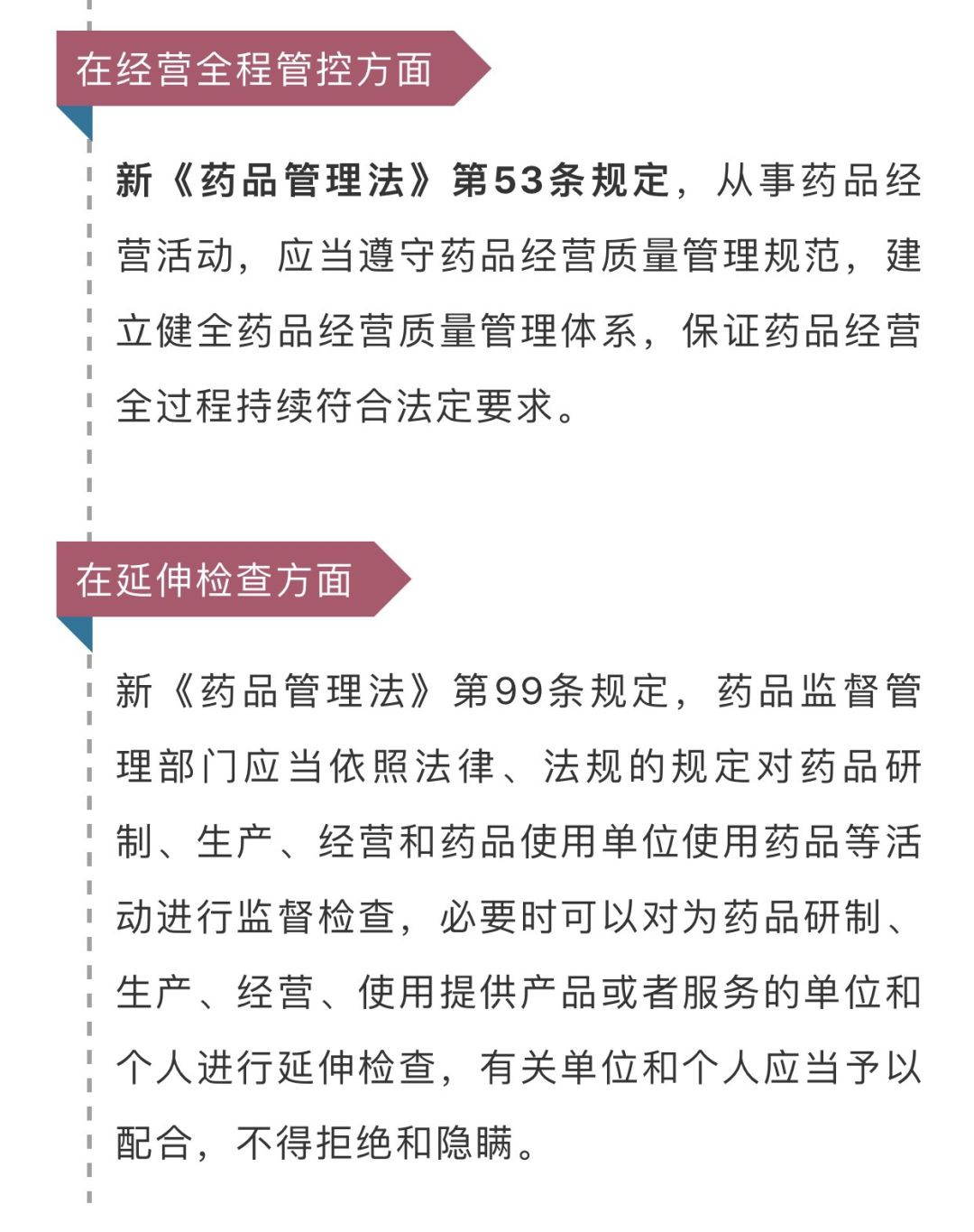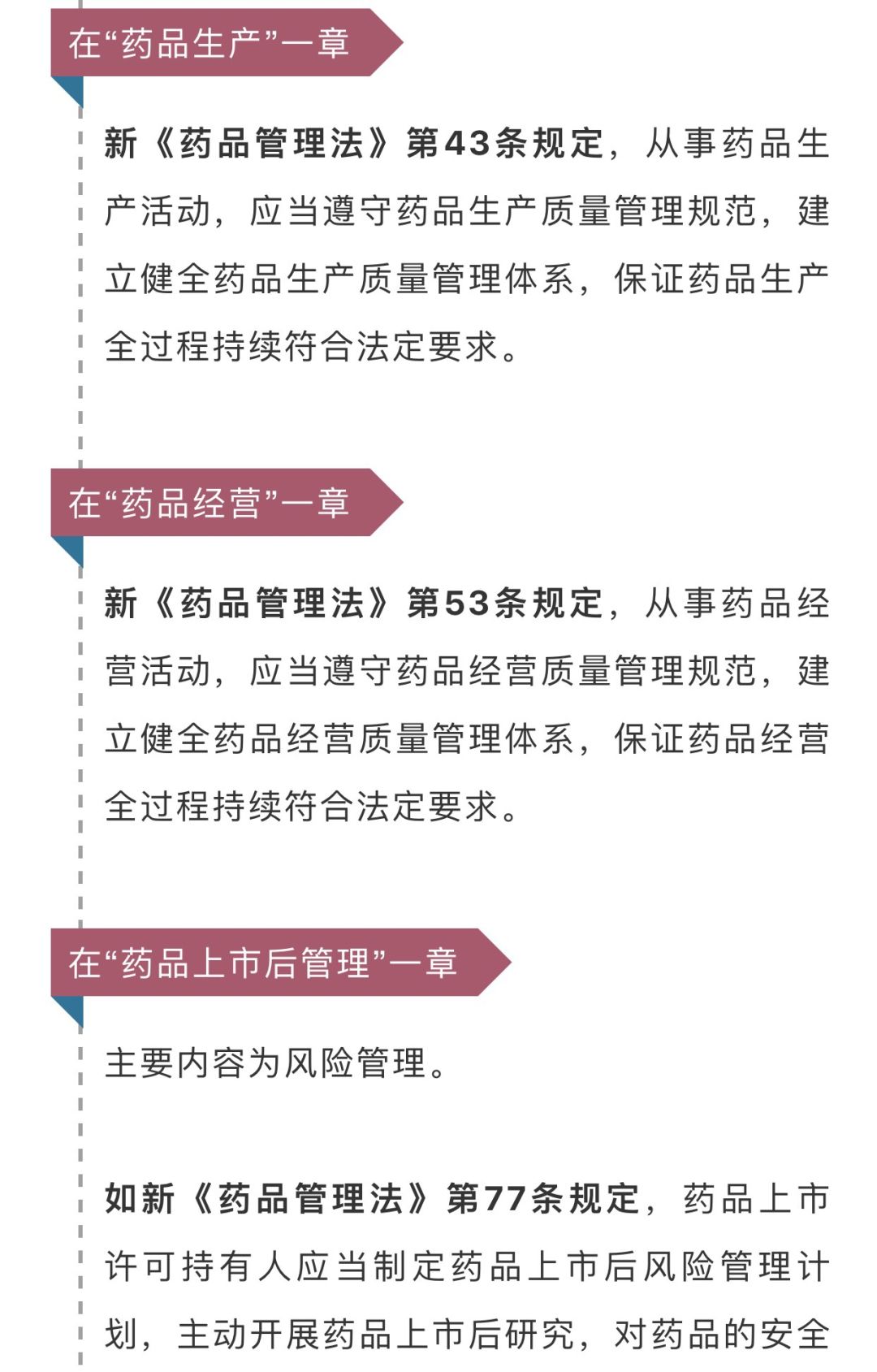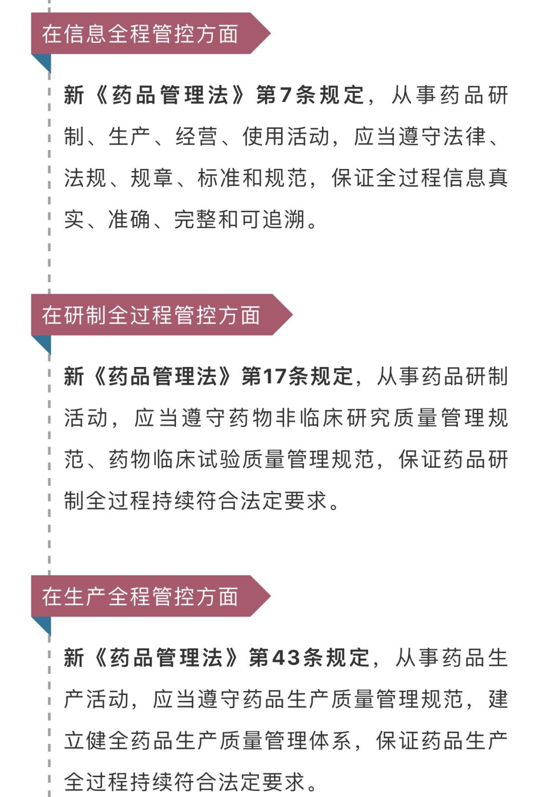 与现行《药品管理法》相较,新《药品管理法》在篇章结构上具有以下特点:一是按照药品全生命周期进行篇章结构设计,从研制监管到使用监管。二是突出了药品上市许可持有人,其对药品全生命周期管理依法承担相应法律责任。三是增加了药品储备与供应,与新法所确立的药品管理目标之一“可及”紧密相联。四是增加了药品上市后管理,与“放管服”改革以及全球药品风险管理趋势相适应,强化药品风险的持续管理、递进管理。