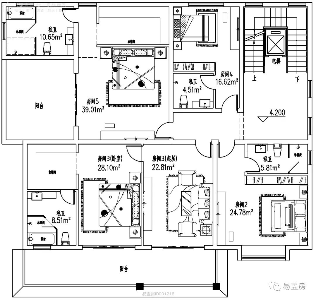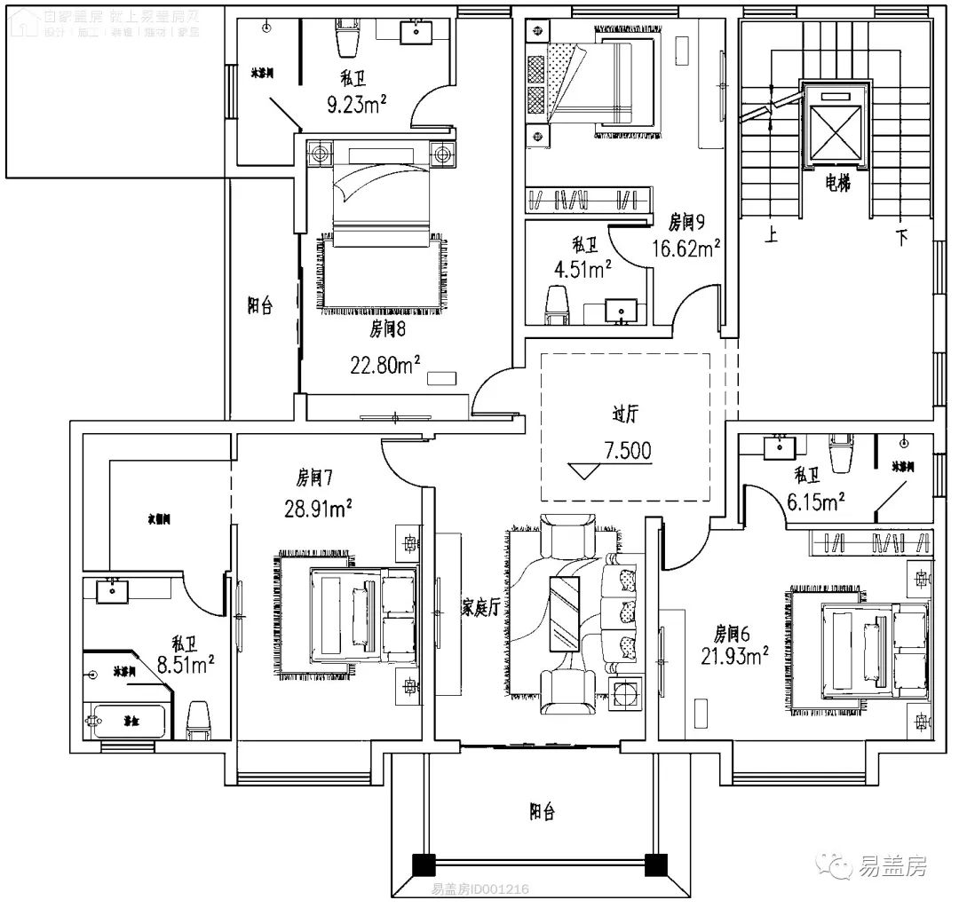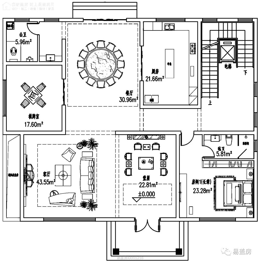 考虑到长辈年迈,一层设置带私厕的长辈房。东侧是棋牌室和公卫。由于别墅层数较多,上下楼行动不便,除楼梯外还设置电梯。