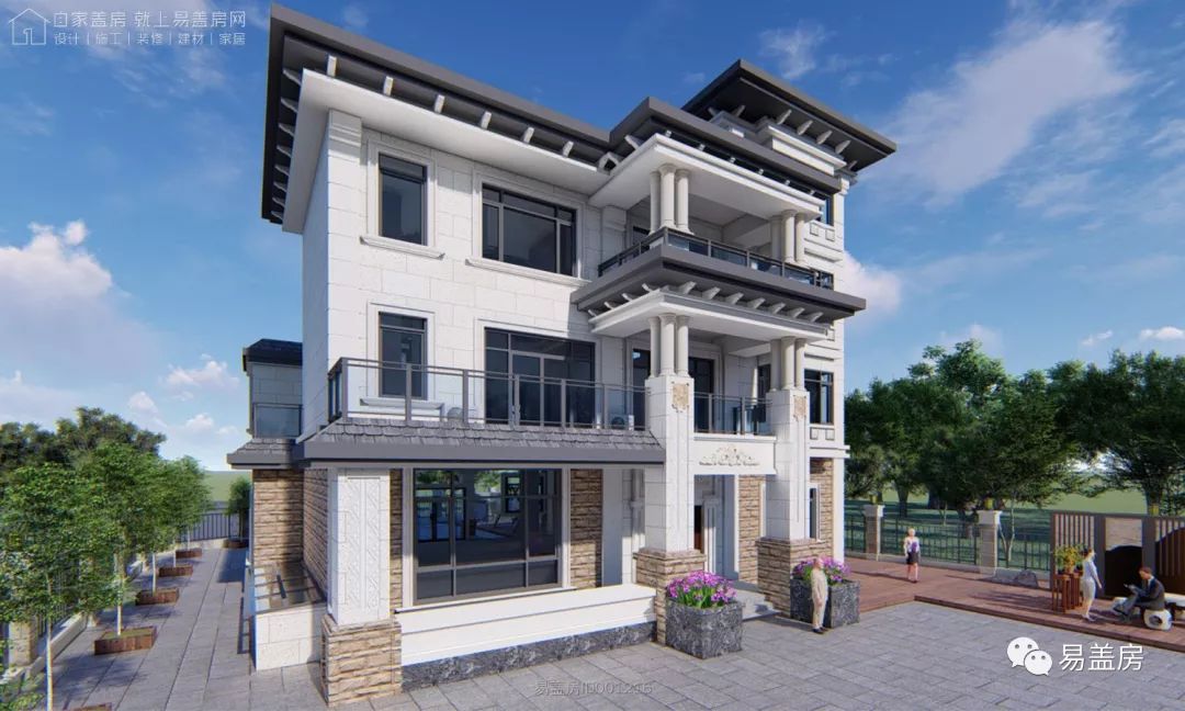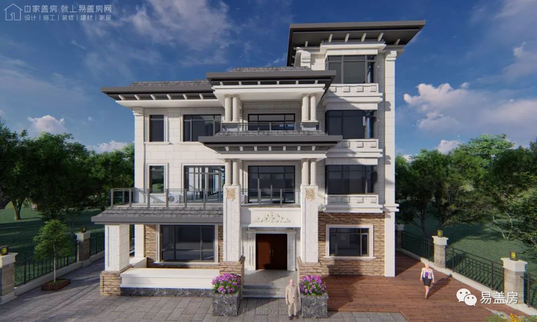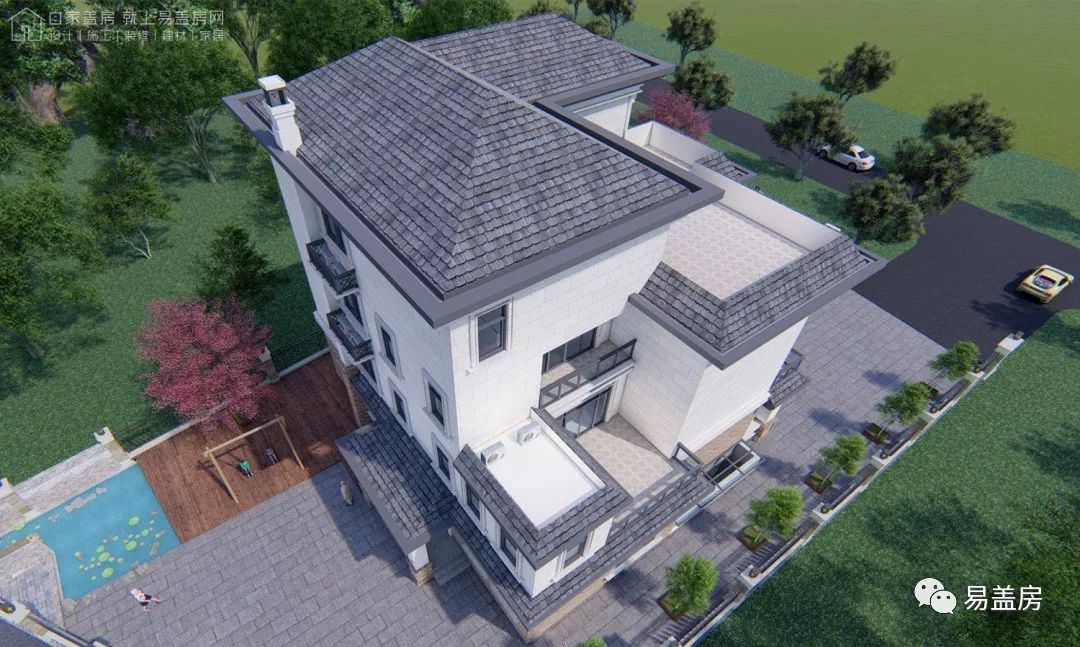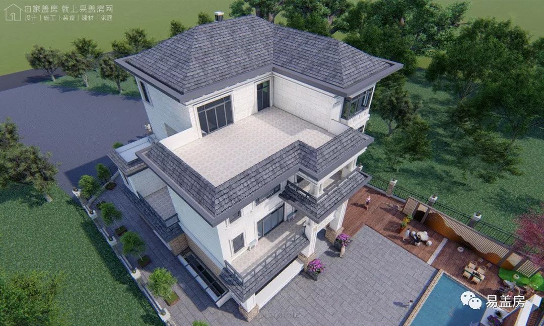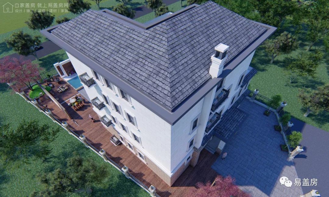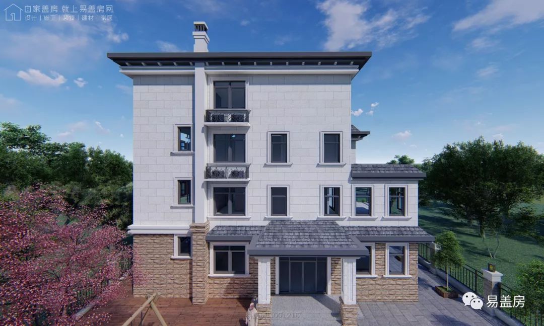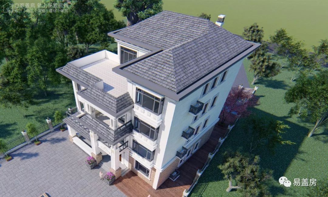 整体充分利用周围的绿植景观, 各立面的开窗,阳台和露台都能欣赏到建筑周围的景致。屋顶采用坡屋顶,整体造型豪华大气,富有浪漫的韵味。