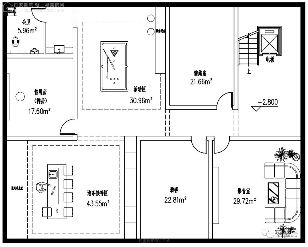 地下室的功能定位是娱乐、储物,和接待访客。楼梯旁设置较大面积的储藏室,储物功能强大。西侧设置影音室,地下室创造良好的暗光环境。根据业主的喜好设置酒窖、禅房、活动区和可接待客人的茶室。别墅的功能得到极大的丰富。