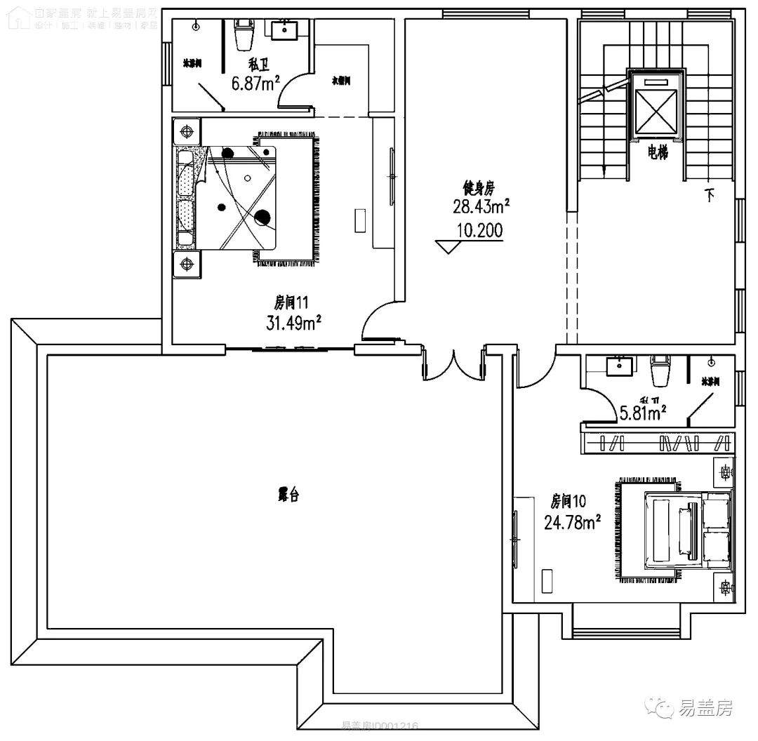 四层除两间带私卫的卧室外,根据业主需求设置健身房,北侧楼顶留出大面积露台。兼具实用和娱乐两重功能,方便衣物晾晒,也可供业主及家人室外活动,楼顶露台的私密性也极强。