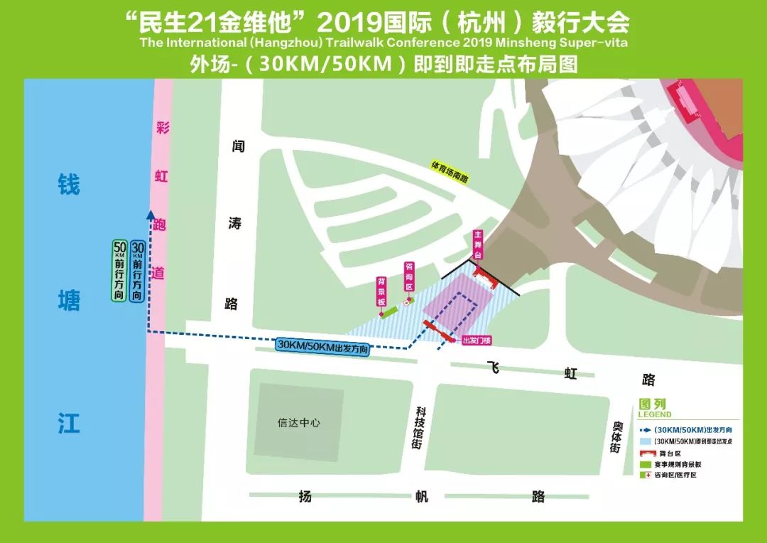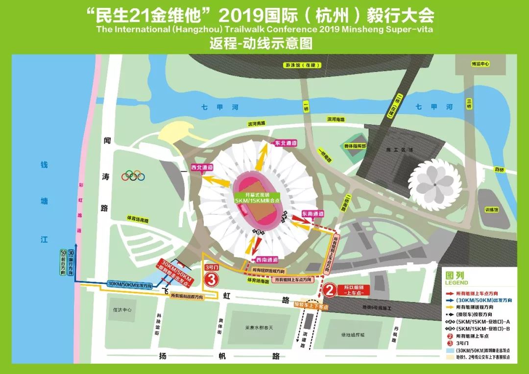 所有组别选手均从飞虹路口下江堤,按红绿灯通行规则行进,从飞虹路3号门进入奥体中心,再由西南通道、东南通道任一通道进入奥体中心主体育场。