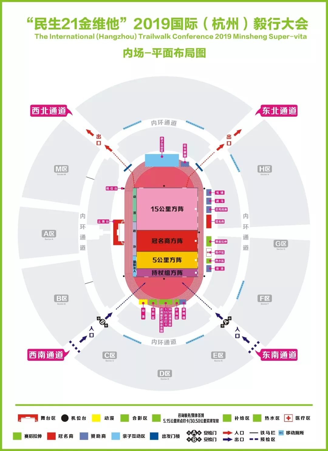 注意事项5公里组/15公里组选手由飞虹路2号门进入奥体中心,而后再由西南通道、东南通道进入主体育场。安检门设置在两个通道入口处,各配备8台安检门,4台X光机扫描仪;选手凭号码布入场、工作人员凭工作证件入场,为了加快安检/进场时间,请各位轻装上阵。