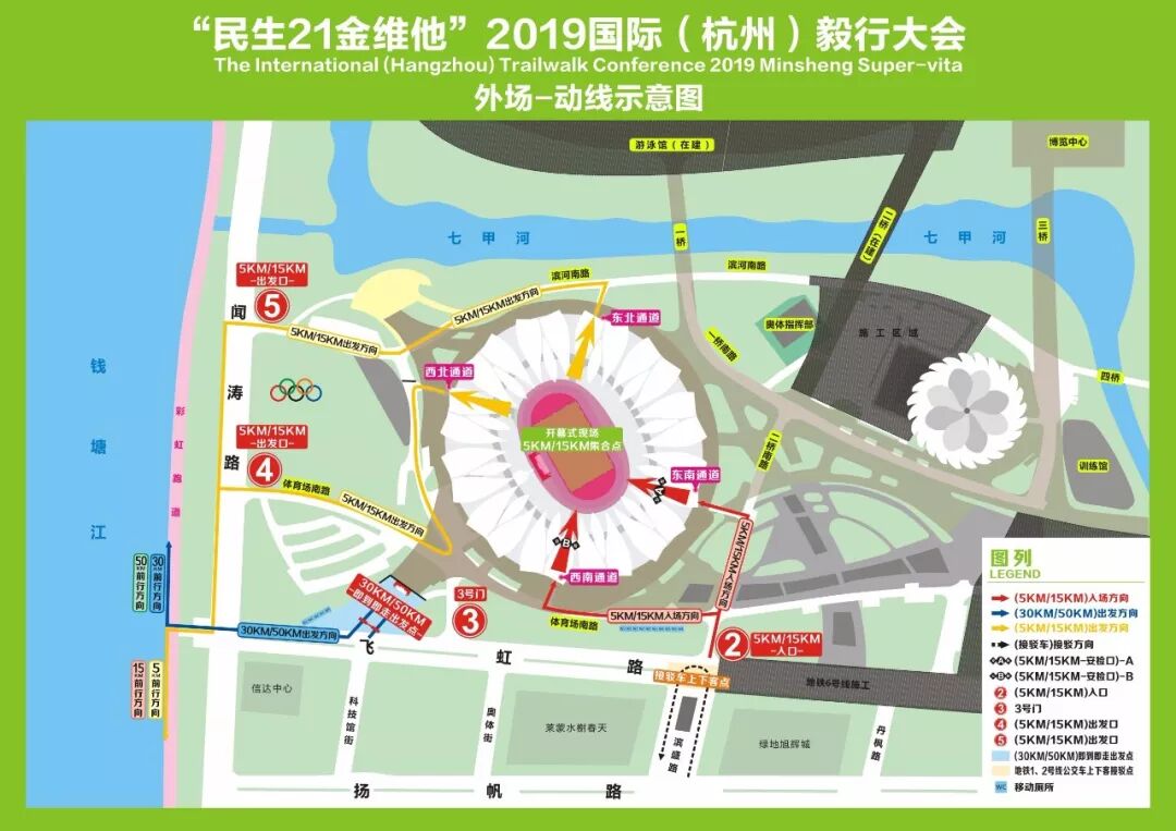 5公里组/15组公里选手出发时,分别从西北通道、东北通道出发。西北通道出发的选手,沿体育场东路由4号门出奥体,沿闻涛路前行;东北通道出发的选手,沿滨河南路由5号门出奥体,沿闻涛路前行;而后都沿飞虹路口上江堤,朝西前行。