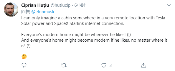 Ciprian Hu?iu:我能想象在一些偏远地方的度假小屋里,只要有特斯拉的太阳能和SpaceX “星链”互联网连接,每个人都能有一个自己喜欢的现代化房子,每个人的房子都可以变成他所喜欢的那样,不管在哪里。