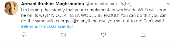 Armani Ibrahim-Maghsoudlou:我希望这表示您补充性的全球WiFi即将面世?尼古拉·特斯拉(奥地利著名发明家)会为你骄傲的,你有同样的精力来做任何你想做的事情,快等不及了。