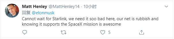 Matt Henley:快等不及“星链”了,我们这里的网络太垃圾了,知道它支持spaceX的项目非常棒。
