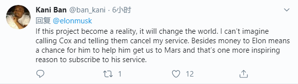 Kani Ban:如果这个项目成为现实,它将改变世界。我无法想象打电话给Cox(考克斯通讯公司),并告诉他们取消我的服务。对伊隆来说,除了赚钱还有另一个机会,就是将我们送上火星,这也是为什么一直关注他的原因。
