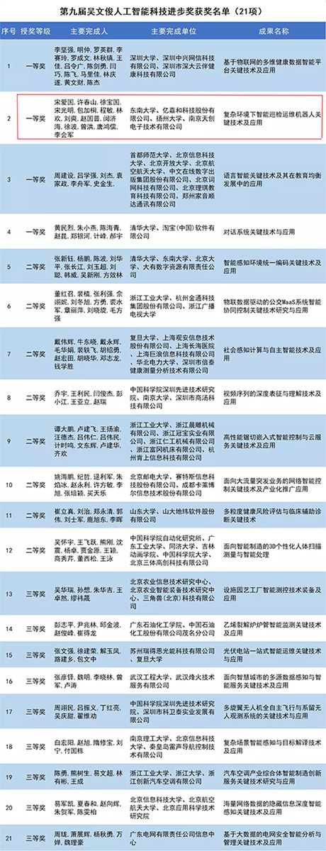 南京天创电子技术有限公司与东南大学,扬州大学,亿嘉和科技股份有限公司联合研发的“复杂环境下智能巡检运维机器人关键技术及应用”获评“吴文俊人工智能科技进步奖一等奖”。