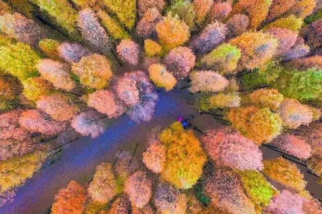 穿行林间,在呼吸着数万亩水杉林、柳杉林带来的负氧离子的同时,层层交织又明确界限的色彩也惊艳眼球。