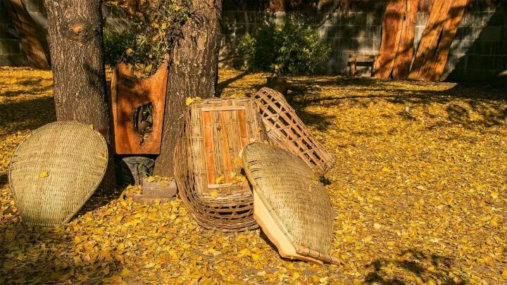 3万多株银杏遮天蔽日,散落一地的金黄,倒向一旁的背篓,是无人打扰的静谧。