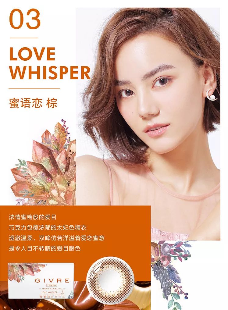 这款棕色渐变的 密语恋棕 ,巧克力包裹浓郁的太妃色糖衣比纯色更加深邃,澄澈温柔,配戴后双眸仿若洋溢着爱恋蜜意,有种泪眼朦胧感。,更显得柔情似水,美感爆棚,是顾家的巨蟹和感性的双鱼的桃花运首选!