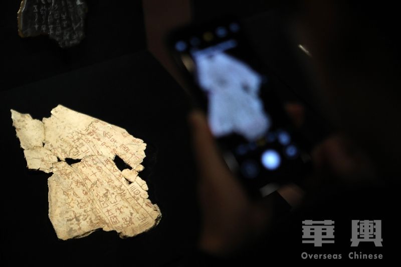 2019年10月24日,参观者拍摄一块字涂朱卜骨刻辞。(图片来自华舆 李国庆摄)