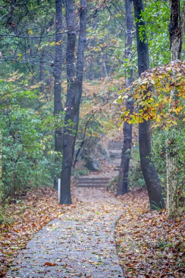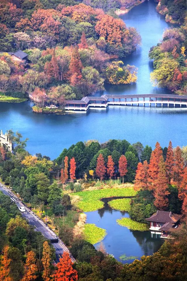 选一个能见度高的天气,爬上九曜山,可以看到西湖全景,包括苏堤、雷峰塔、浴鹄湾等,沿途落叶满地。秋天时,树种丰富的浴鹄湾尤其缤纷多彩,令人过目不忘。