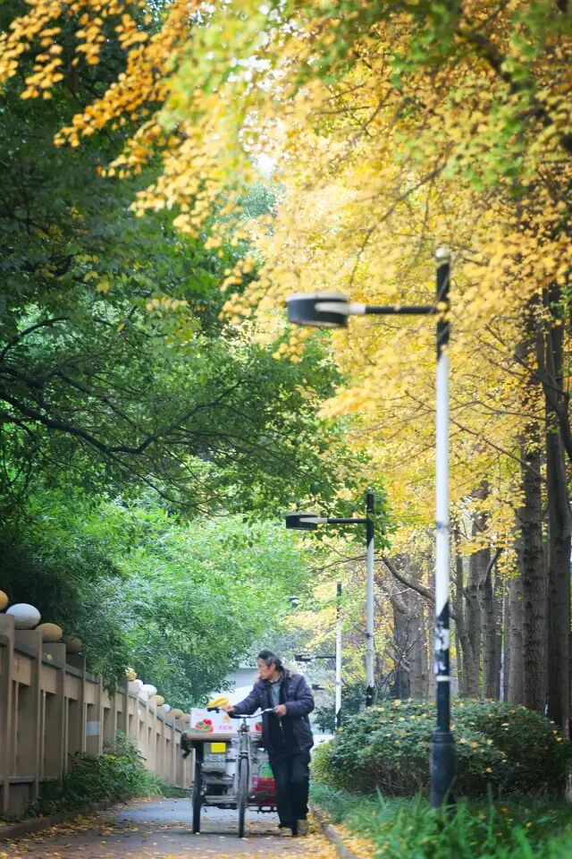 小路不宽,两边长满了银杏树,树很高大,枝叶相互交叠。当银杏美丽的扇形叶片变成柠檬黄色,在阳光的映照下,一片璀璨的金黄,不时有叶片如彩蝶般飘落,洒满地面,置身其中,是一种静谧和醉人的享受。