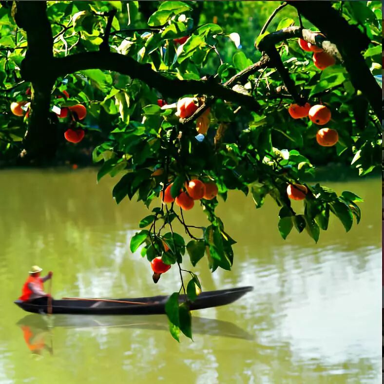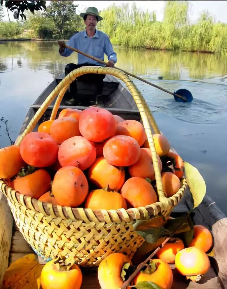尤其在夕阳西下之时,晚霞染红天边,与满树红柿遥相呼应,倒影水中,真是天光云影,相映成绝妙的田园风光画,令人流连忘返。