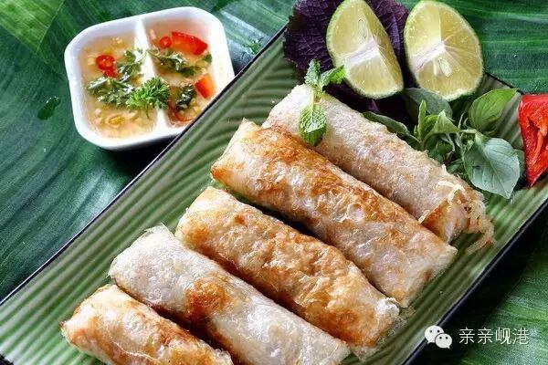 a:春卷春卷是最受越南人欢迎的一道菜,春卷皮用糯米做成,裹在由豆芽、粉丝、鱿鱼丝,虾仁、葱段等做成的馅外面,放入油锅中炸至酥黄。吃时蘸以鱼露、酸醋、辣椒等调料。
