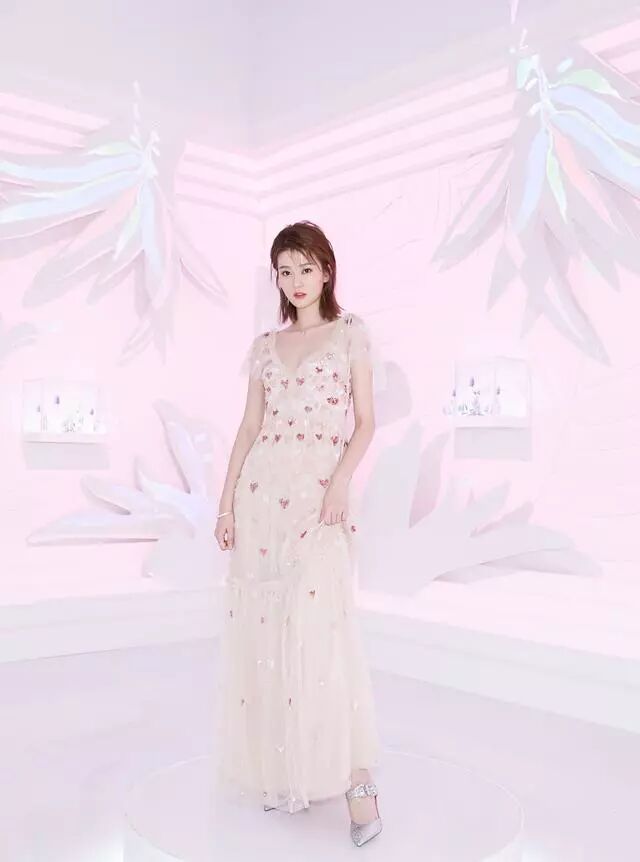 乔欣的形象十分少女,和甜美的造型十分搭配。V领的长裙将她性感的身材展示十分醒目,纯白的长裙搭配红色的亮片装饰,显得明艳而充满少女的活力。银色的高跟鞋让乔欣气质提升不少,整体风格像是甜美公主一般,适合大多数女生。