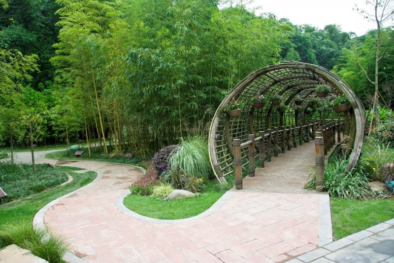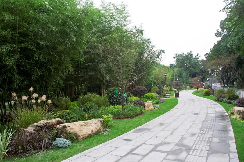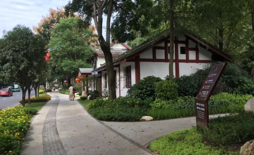 从望江楼公园西门起沿街一路走过去只见公园的围墙早已不见取而代之的是景观优美季相分明的多样性植物景观在通透大气的生态空间中石板铺在草丛中,蜿蜒向前形成从路边延伸至公园内部的道路