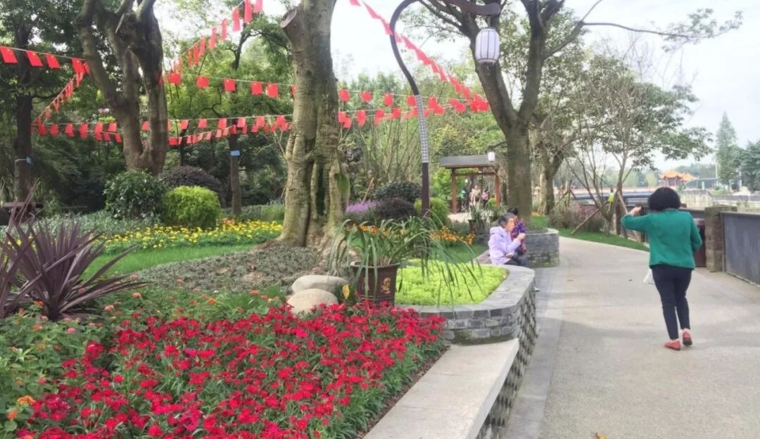 漫步在文化公园东大门外的小路一边是潺潺流动的河水一边是鲜花绿植形成的植物景观这块闲适的空间是市民和游客放松的休憩地文化公园东大门区域
