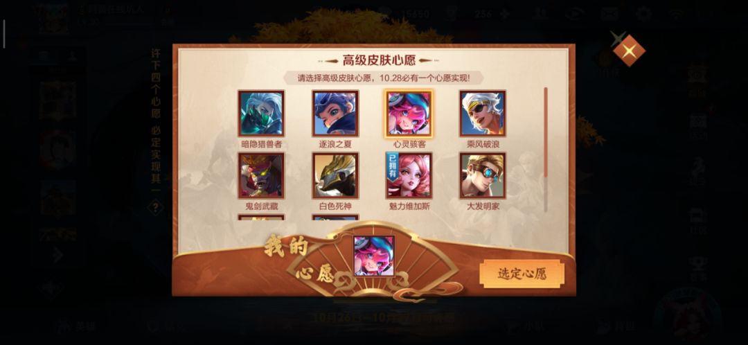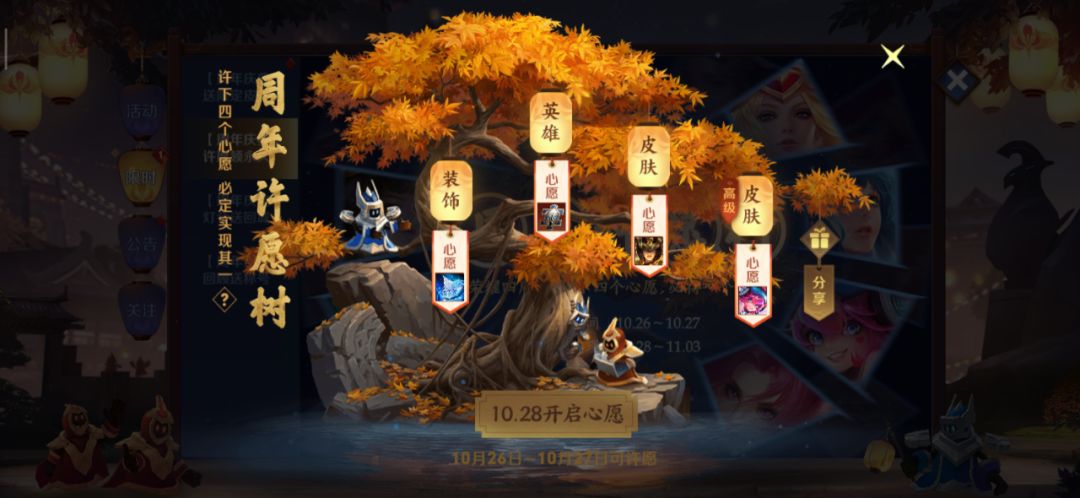 许愿活动总共有四个许愿池,每位玩家可以许四个愿望,最后两个愿望可选伴生皮肤(30款)和史诗皮肤(10款)。在10月28日将随机实现一个愿望,获得永久皮肤的概率估计在40%左右,获得史诗皮肤的概率估计在5%左右,如果是全英雄或全皮肤玩家,可以选择20个英雄碎片或10个/20个皮肤碎片代替。