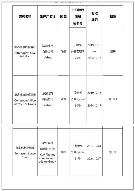 批准KVP Kiel有限责任公司生产的托曲珠利混悬液在我国再注册,核发《进口兽药注册证书》,执行农业农村部公告第216号发布的同品种质量标准、说明书和标签。