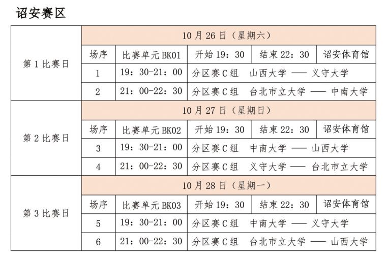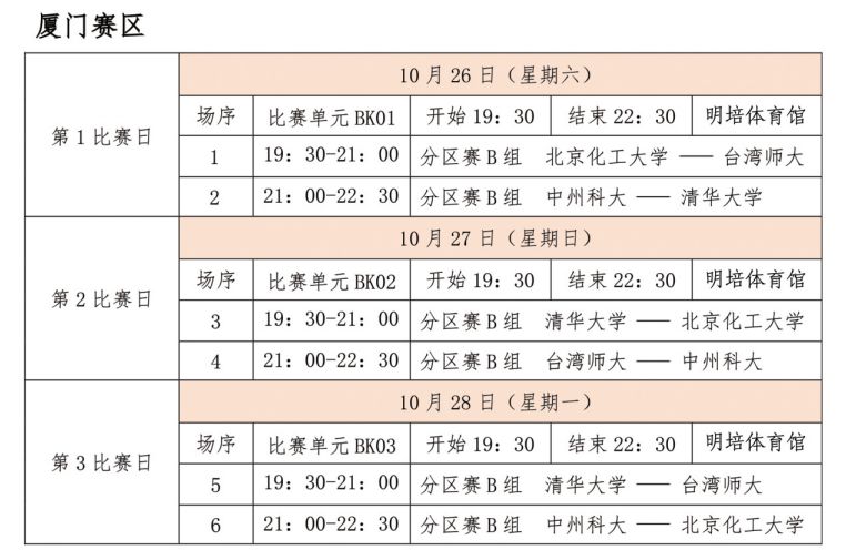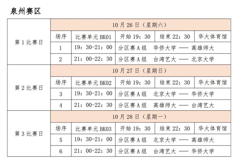 — 比赛地点 — 10月25日在福州市举行开幕式及揭幕战:北京大学vs健行科技大学地点:福建省体育馆(福州五四路)10月26日-28日预赛:厦门、泉州、诏安、大田10月29日-11月1日前8强决赛:龙岩市10月29日-11月1日后8名排位战将在顺昌举行