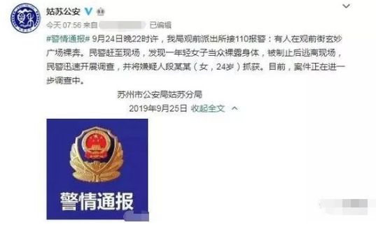 9月25日,苏州警方报案称,一名24岁的女子在苏州广场裸奔。