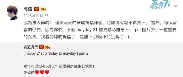 对于新的一年,五月天也有自己的期许。2019年恰好也是五月天出道20年,他们希望可以继续打闹20年、40年,继续唱到80岁,继续迎接新的一年。我们作为五月天的歌迷,一直听着他们的歌成长,也看着他们共同走过青春岁月。唯一还没成家的阿信,到底能不能让歌迷们听到好消息,他和Jolin的恋情会是真的吗?