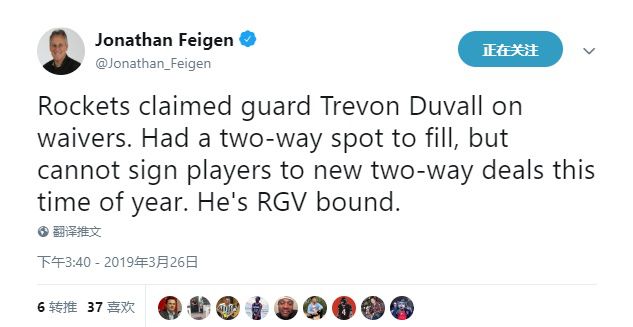 日前,《休斯顿纪事报》记者JonathanFeigen在个人社交媒体上透露,火箭队已经正式认领特雷旺·杜瓦尔。
