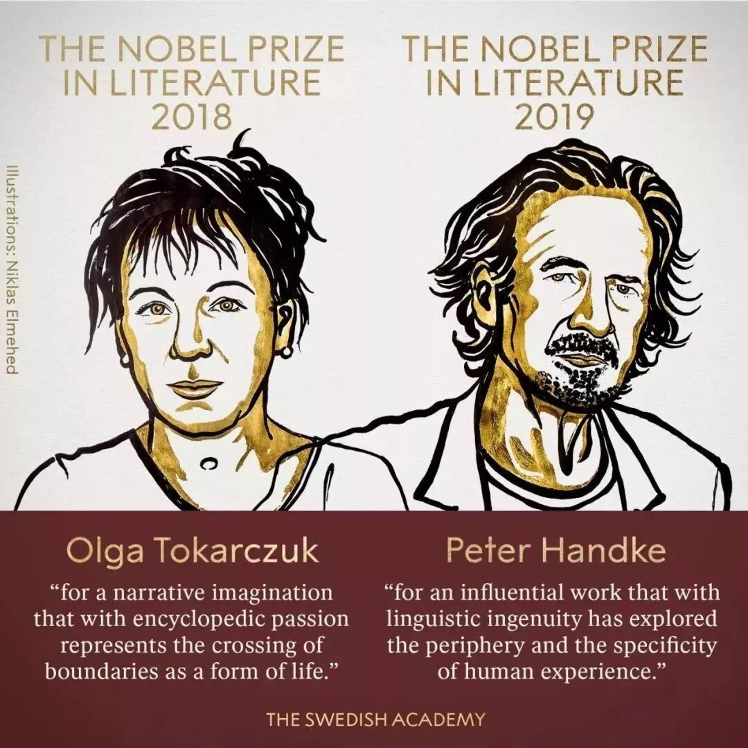 10月10日,备受期待的诺贝尔文学奖终于揭晓了谜底!去年因为丑闻事件推迟颁奖的瑞典文学院,这次一口气颁布了“双黄蛋”,波兰作家奥尔加·托卡尔丘克,奥地利作家彼得·汉德克,分别成为了2018年、2019年两届诺贝尔文学奖的获奖者。
