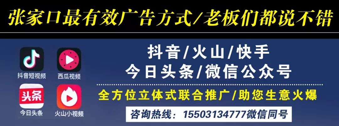 以上广告商家,都是我们微播张家口的战略合作伙伴,微播张家口拥有张家口各区县十二个微信公众号几十万粉丝,还有今日头条,抖音,快手,火山小视频等专业策划。广告发布联系电话:15503134777(微信同号)