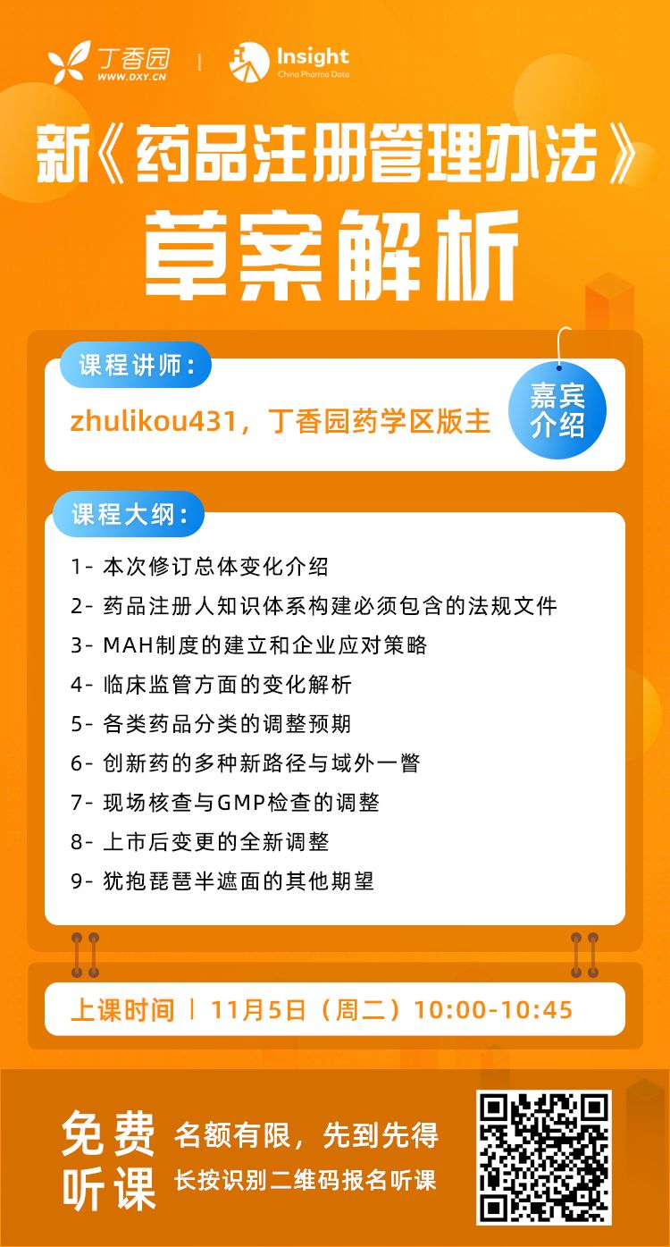 11 月 5 日(周二),本期《Insight 线上讲堂》特别邀丁香园药学区版主 zhulikou 431老师为大家做新《药品注册管理办法》草案解析的分享,聚焦草案变化要点,探寻企业应对策略,洞察产业趋势未来!