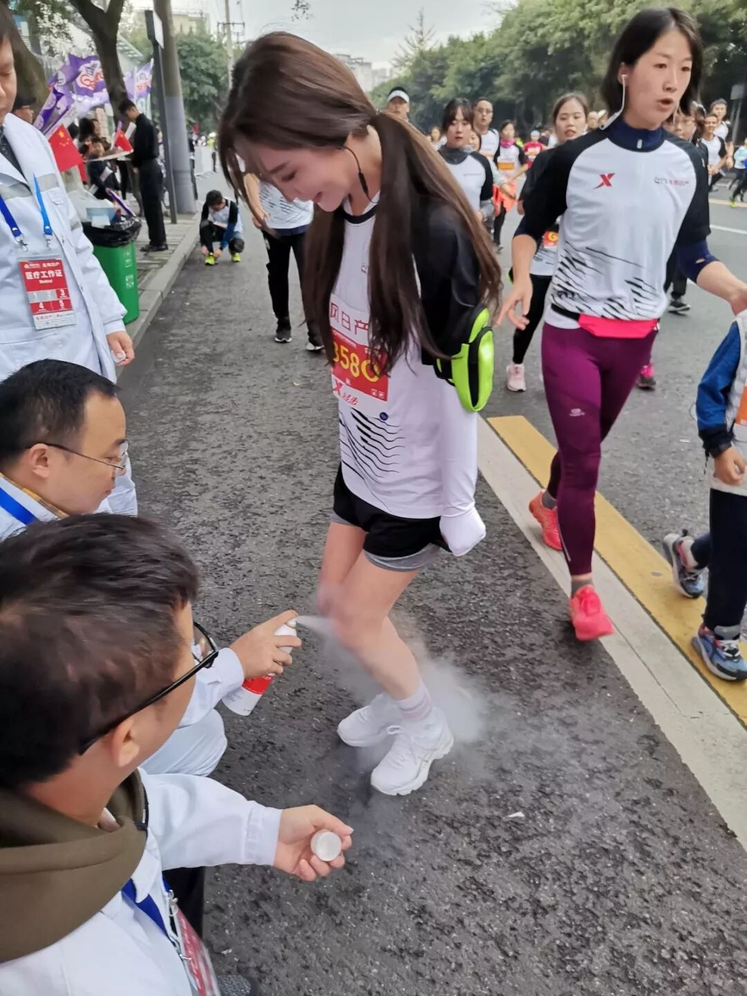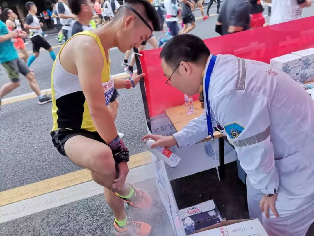 赛程中,我院医护人员不仅给每一位经过的选手加油,而且,为腿部抽筋及疼痛不适的选手们进行了拉伸、喷药等治疗,极大程度上减轻了选手的痛感,帮助其调整至相对良好的状态,继续完成比赛。