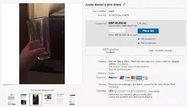 知名人气偶像贾斯汀比伯也有过类似的经历,他在某酒吧点了一杯牛奶喝, 随后该酒吧的员工在他离开后,便将这牛奶杯放到了网络上拍卖,在短短7天内竟喊价到65900英镑,相当于台币54万元。