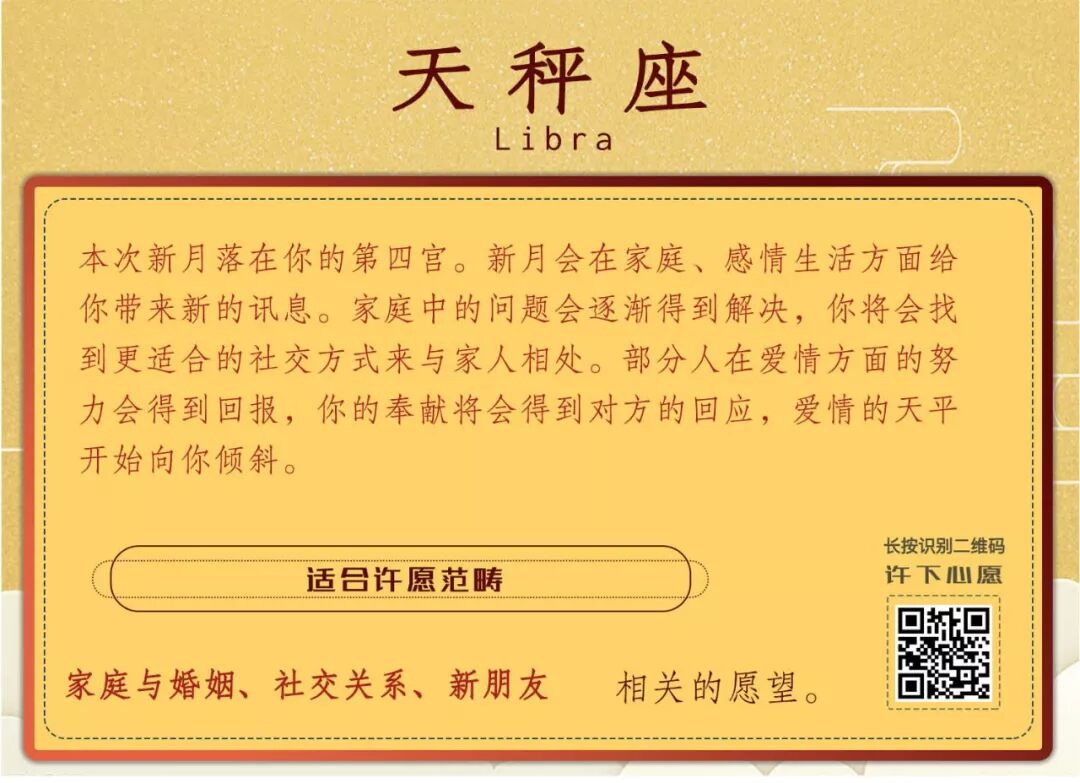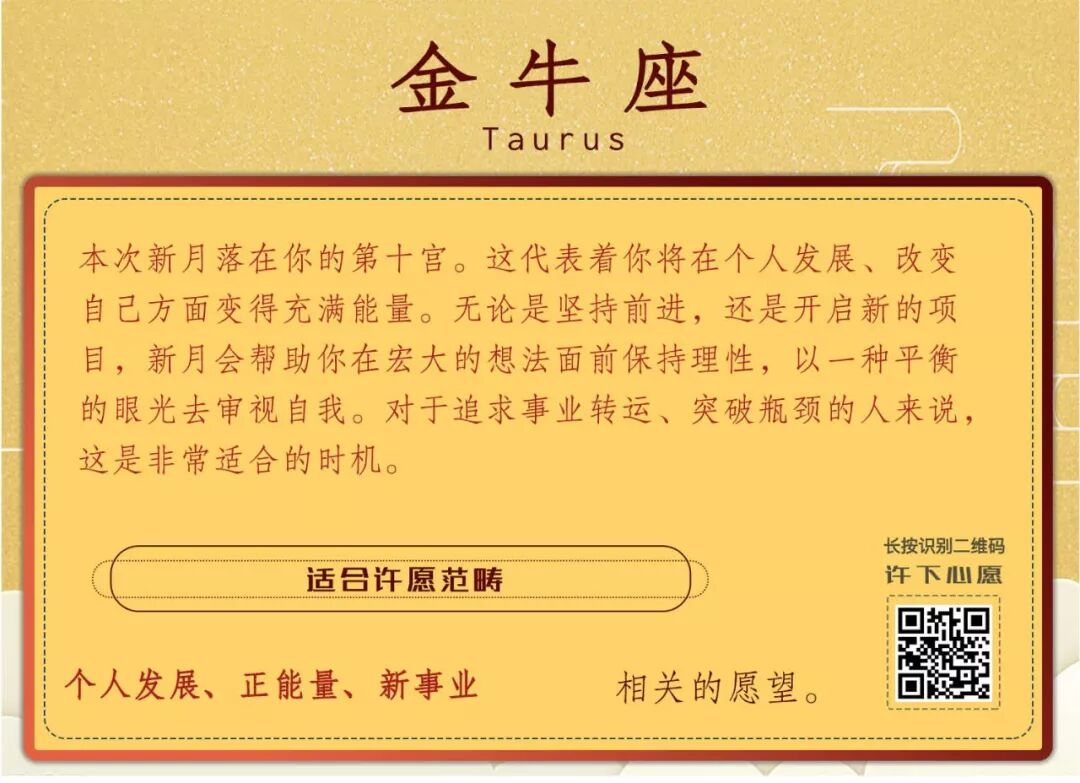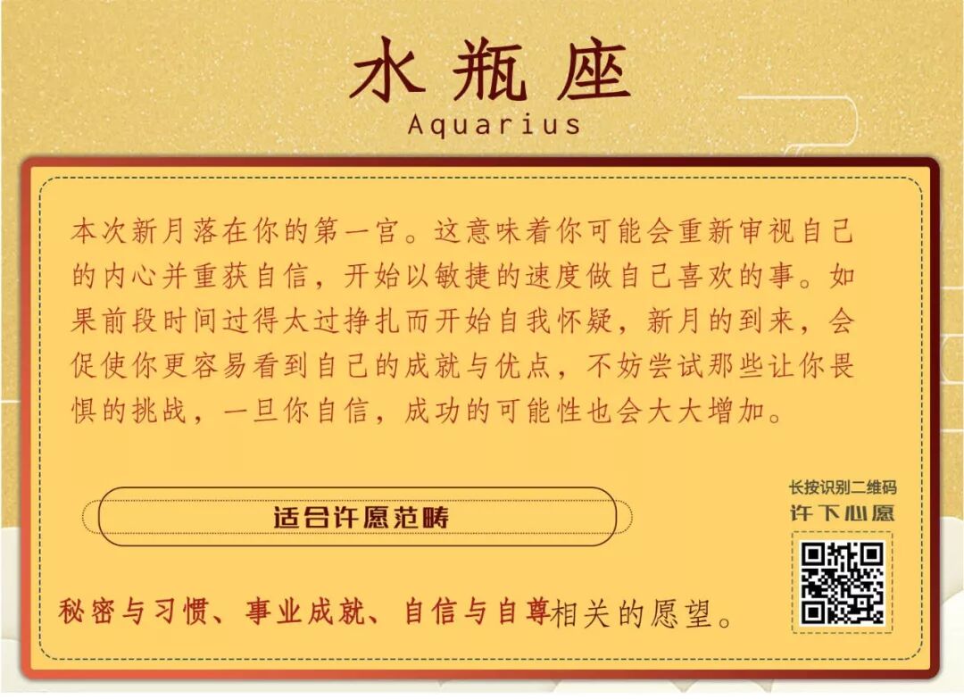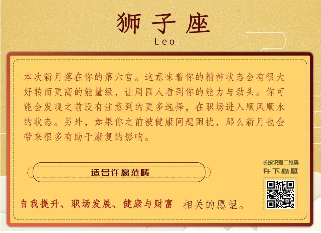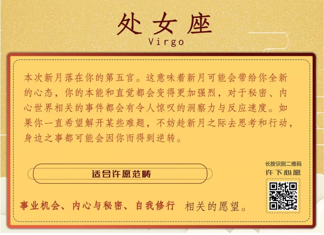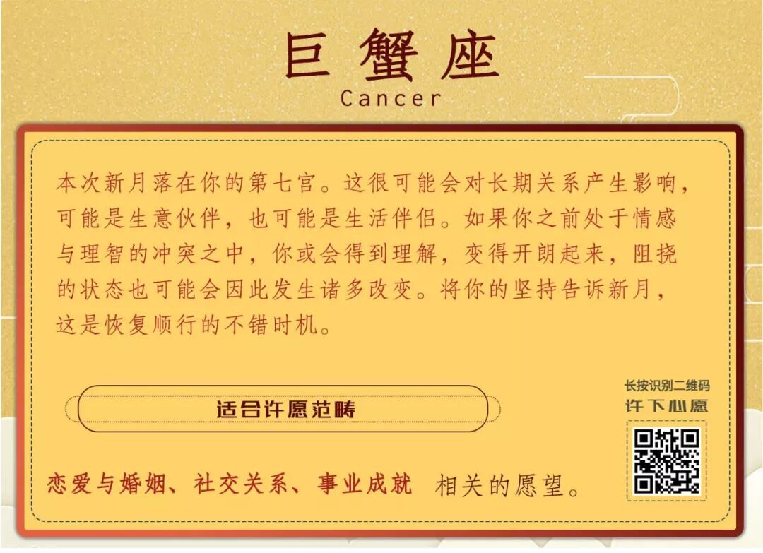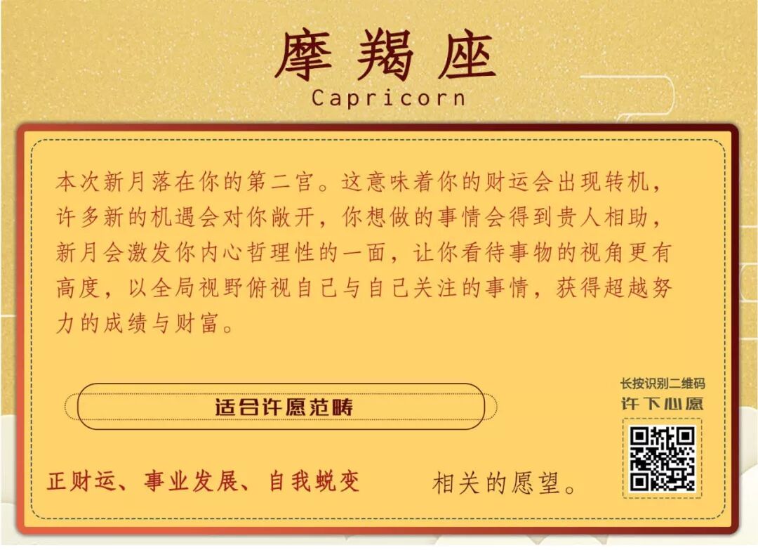 你可以许任何心愿!即使你的心愿并非在本次新月的最有影响的范围内,依然会受到新月的守护。只是说星座会有自己的优势影响,会在某些方面特别加强!