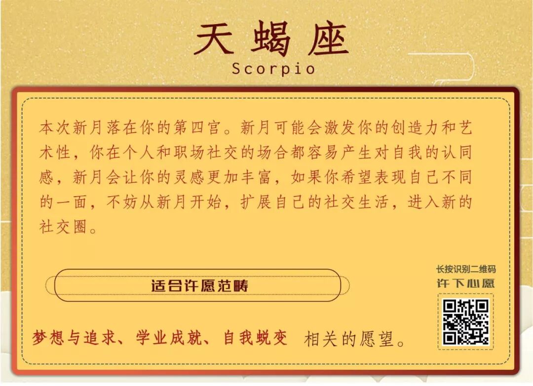 本次新月发生在天蝎座,天蝎座新月所传递的讯息是:火一般的激情,追求属于自己的大梦想与小确幸。