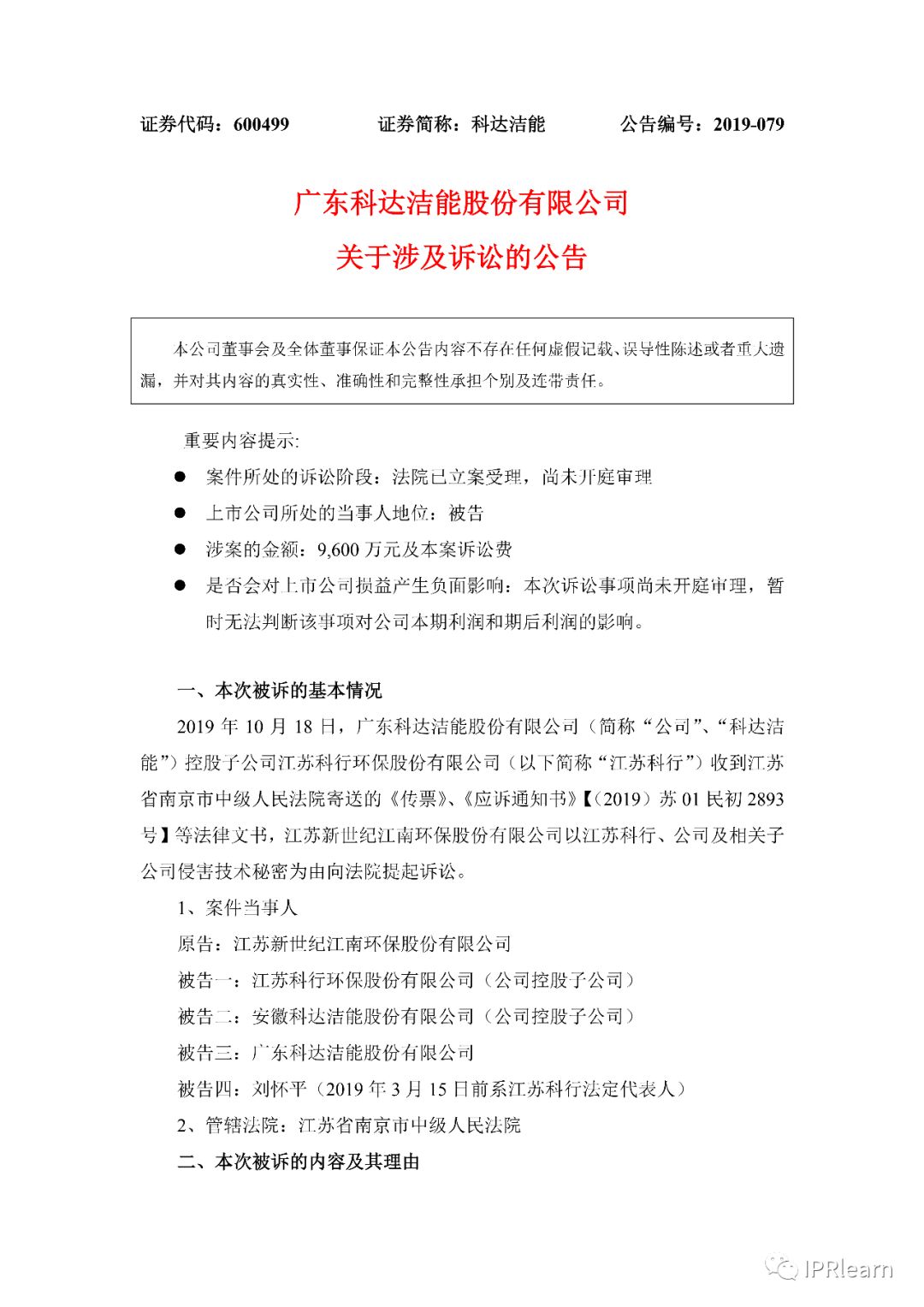 10月22日,科达洁能发布公告称,公司控股子公司江苏科行环保股份有限公司(以下简称“江苏科行”)收到江苏省南京市中级人民法院寄送的《传票》、《应诉通知书》等法律文书,江苏新世纪江南环保股份有限公司(以下简称“江苏新世纪”)以江苏科行、科达洁能及相关子公司侵害技术秘密为由向法院提起诉讼。