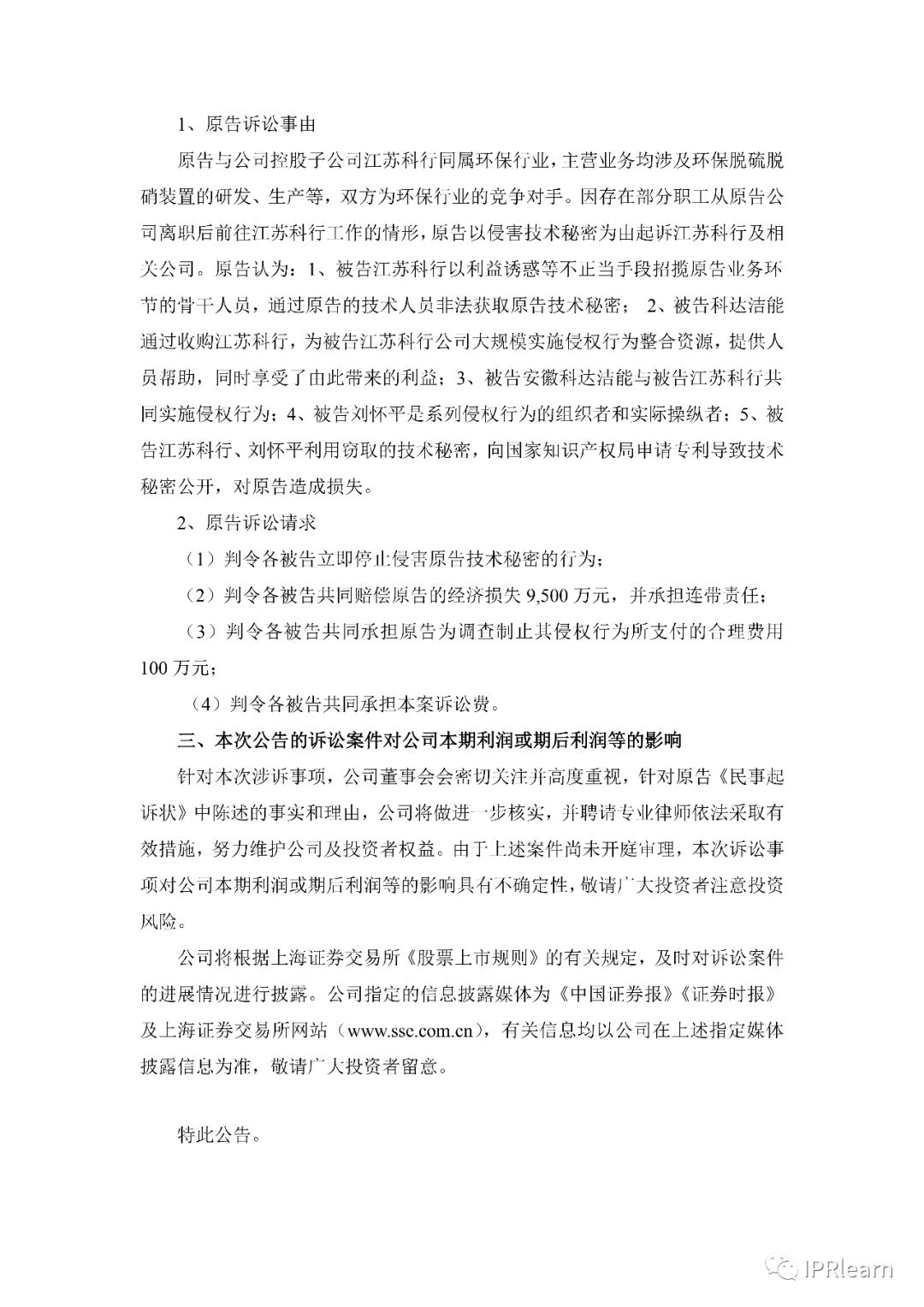 原告与公司控股子公司江苏科行同属环保行业,主营业务均涉及环保脱硫脱硝装置的研发、生产等,双方为环保行业的竞争对手。因存在部分职工从原告公司离职后前往江苏科行工作的情形,原告以侵害技术秘密为由起诉江苏科行及相关公司。