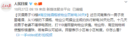 【饮酒男子13楼#高空抛酒瓶被物业罚断电30天#】近日河南焦作一男子夜里喝酒,从13楼扔下酒瓶,物业公司据业主规约执行断电30天处罚。十几天后男子老婆不堪停电困扰,打110请民警向物业求情。物业称,高空抛物将使整栋楼遭殃,若有异议可起诉。民警表示小区有小区制度。