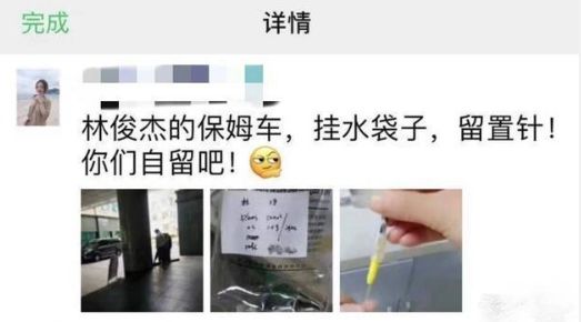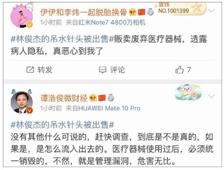 27日,有网友在微博爆料,朋友圈中有镇江医院的护士,发现对方在售卖林俊杰的同款配套药水、已经挂水的血针头;