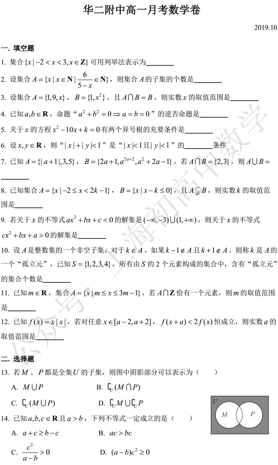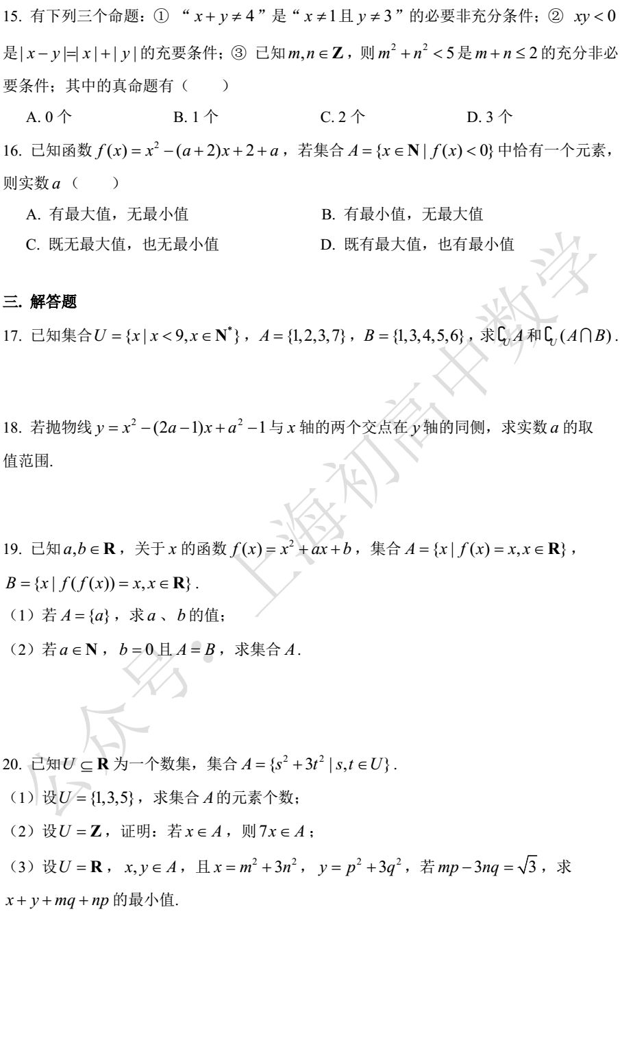 试卷图片仅供学习交流使用,答案仅供参考,最后两题对高一学生而言有一定难度