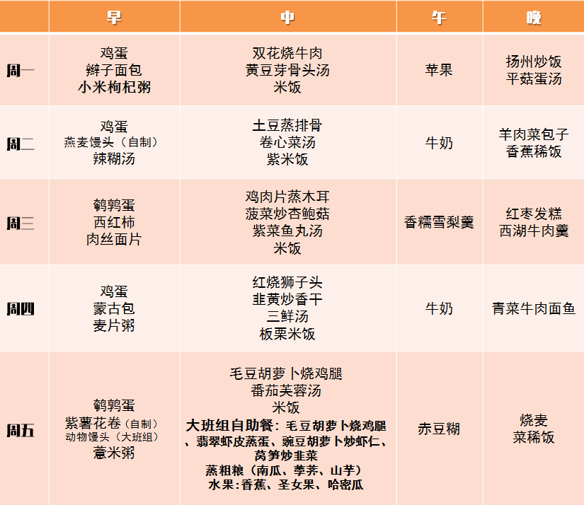 合理营养的饮食搭配对幼儿获得良好的身体素质,促进幼儿健康成长,有着至关重要的影响。中科大幼儿园每天的三餐一点均由专业的保健大夫和食堂工作人员按照科学配比、精心制作而成。快来看看下周我们有哪些好吃又营养的餐点吧!