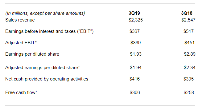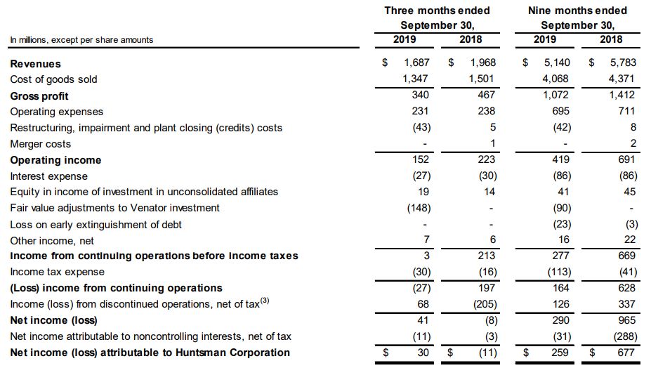 2019年第三季度,亨斯迈以约8100万美元的价格回购了约410万股股票。此前宣布的以21亿美元出售化学中间体和表面活性剂业务的计划仍在进行中,预计将于2020年初结束。将被剥离的业务现在在损益表中列为已终止经营业务,并在资产负债表上持有待售。